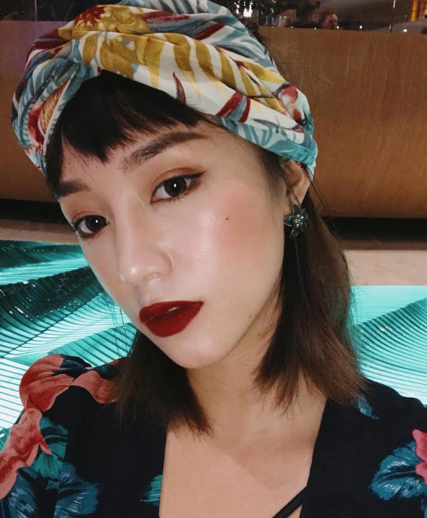 Cô nàng vintage Hà Trúc chọn cho mình chiếc khăn turban họa tiết rực rỡ làm điểm nhấn cho set đồ thanh lịch của mình.