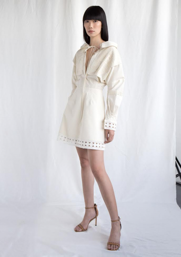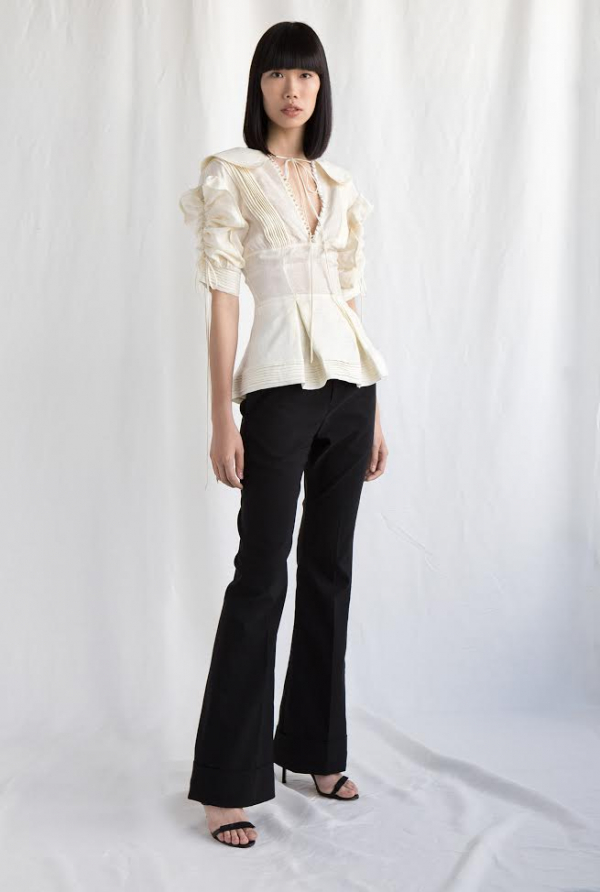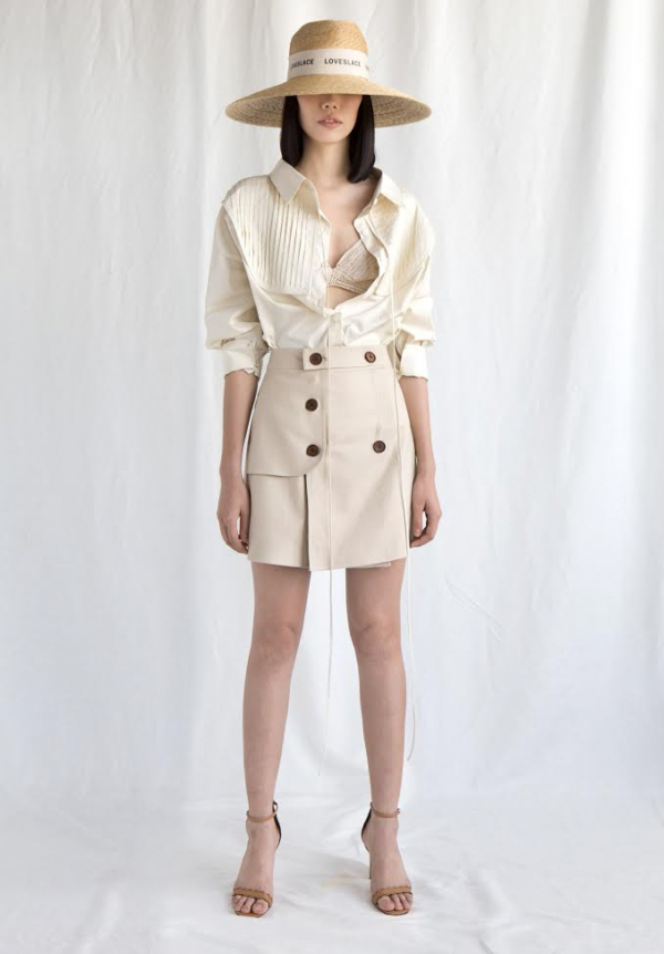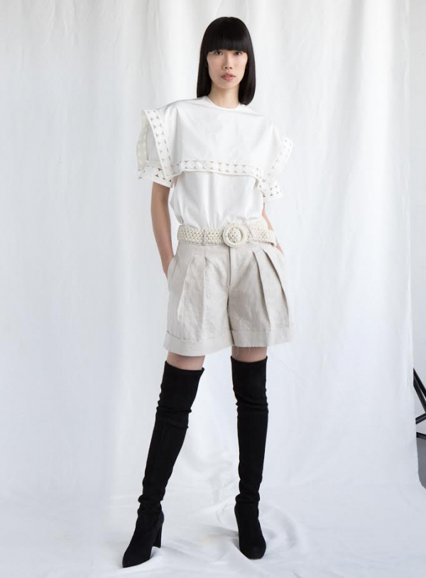 Nhà thiết kế lọt top Forbes “30 under 30” đã cho ra đời những bộ trang phục kết hợp khéo léo giữa hai chất liệu mềm mại như ren, lụa, linen… và chất liệu thô cứng như sợi tự nhiên, bố, khaki… tạo nên sự tương phản mạnh mẽ. Những mẫu quần short hoặc dài với phom dáng suông, rộng thoải mái và phóng khoáng.