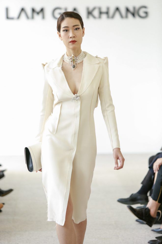 Cũng với chiếc áo dài cách tân nhưng nhà thiết kế Lâm Gia Khang cũng đã sử dụng sắc trắng để tôn lên sự thanh lịch của người mặc.