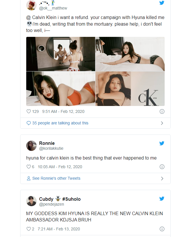HyunA trở thành đại sứ cho thương hiệu đồ lót nổi tiếng Calvin Klein cho khu vực Châu Á hồi đầu tháng 2 được bao fans hâm mộ trầm trồ thì mới đây tháng 3 Jennie Black Pink xuất hiện trên bìa tạp chí High Cut với trang phục của Calvin Klein bị nhiều người chê kém xinh hơn hẳn.