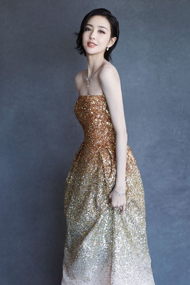 Cô cắt phăng đi mái tóc ngắn, khoe khéo vai trần nuột nà trong bộ váy cúp ngực kim tuyến lấp lánh