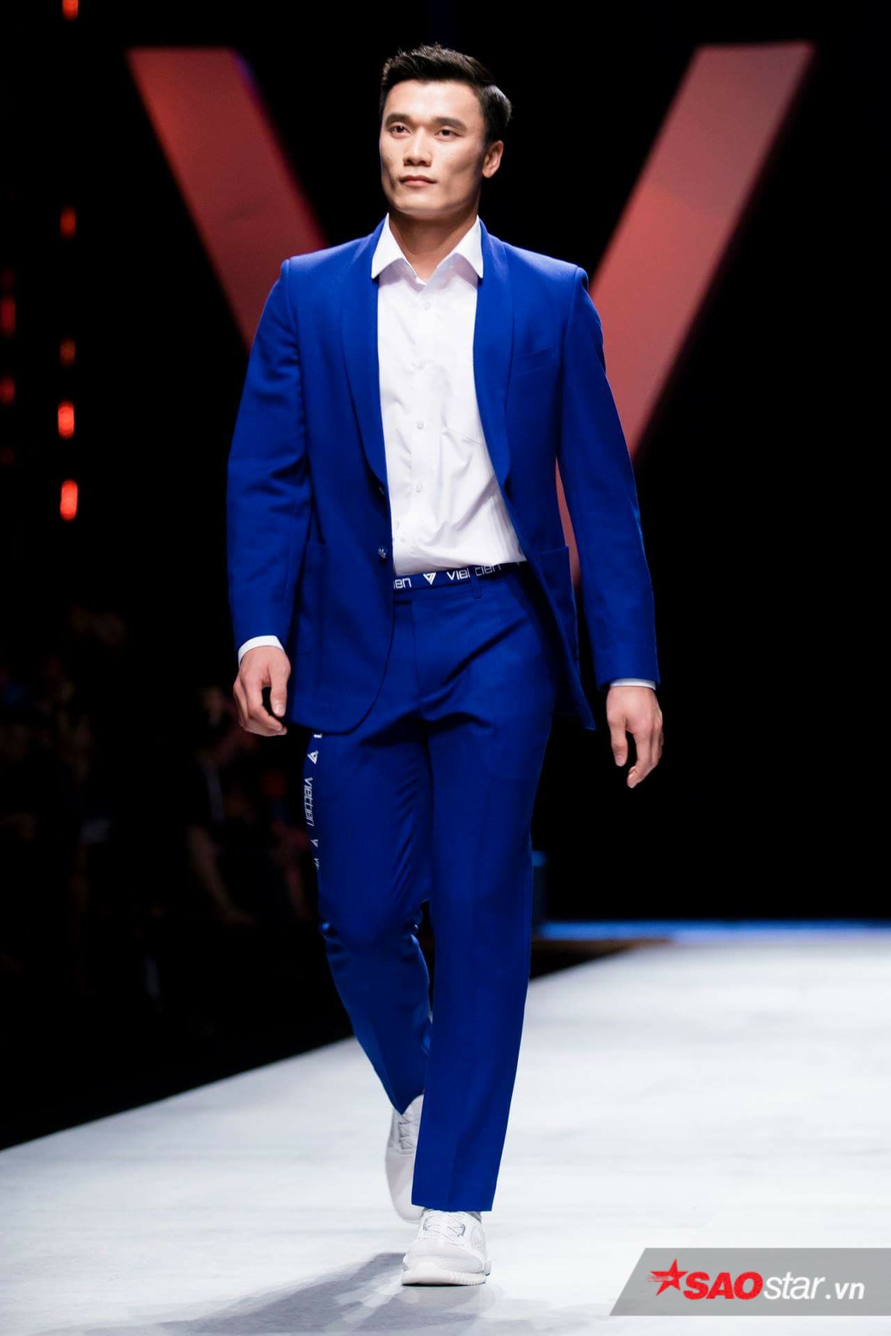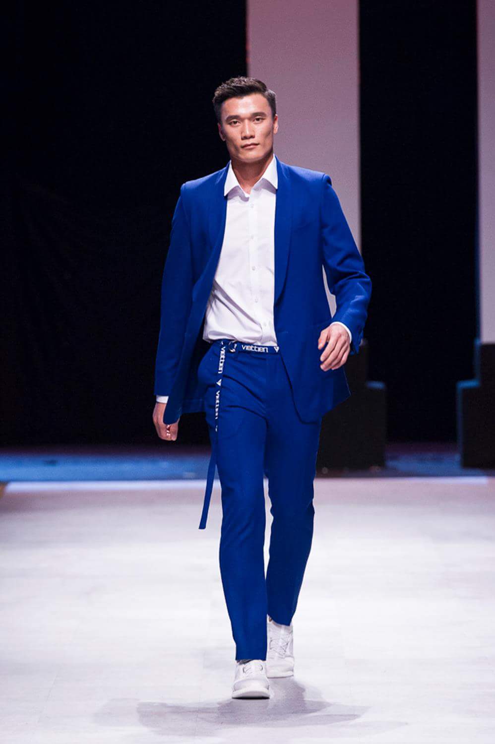 Tuy là lần đầu tiên trình diễn trên sàn runway, nhưng anh chàng không hề để lộ sự lo lắng, trái lại trông chàng thủ môn U23 hoàn toàn tự tin, thần thái không thua kém một người mẫu chuyên nghiệp nào.