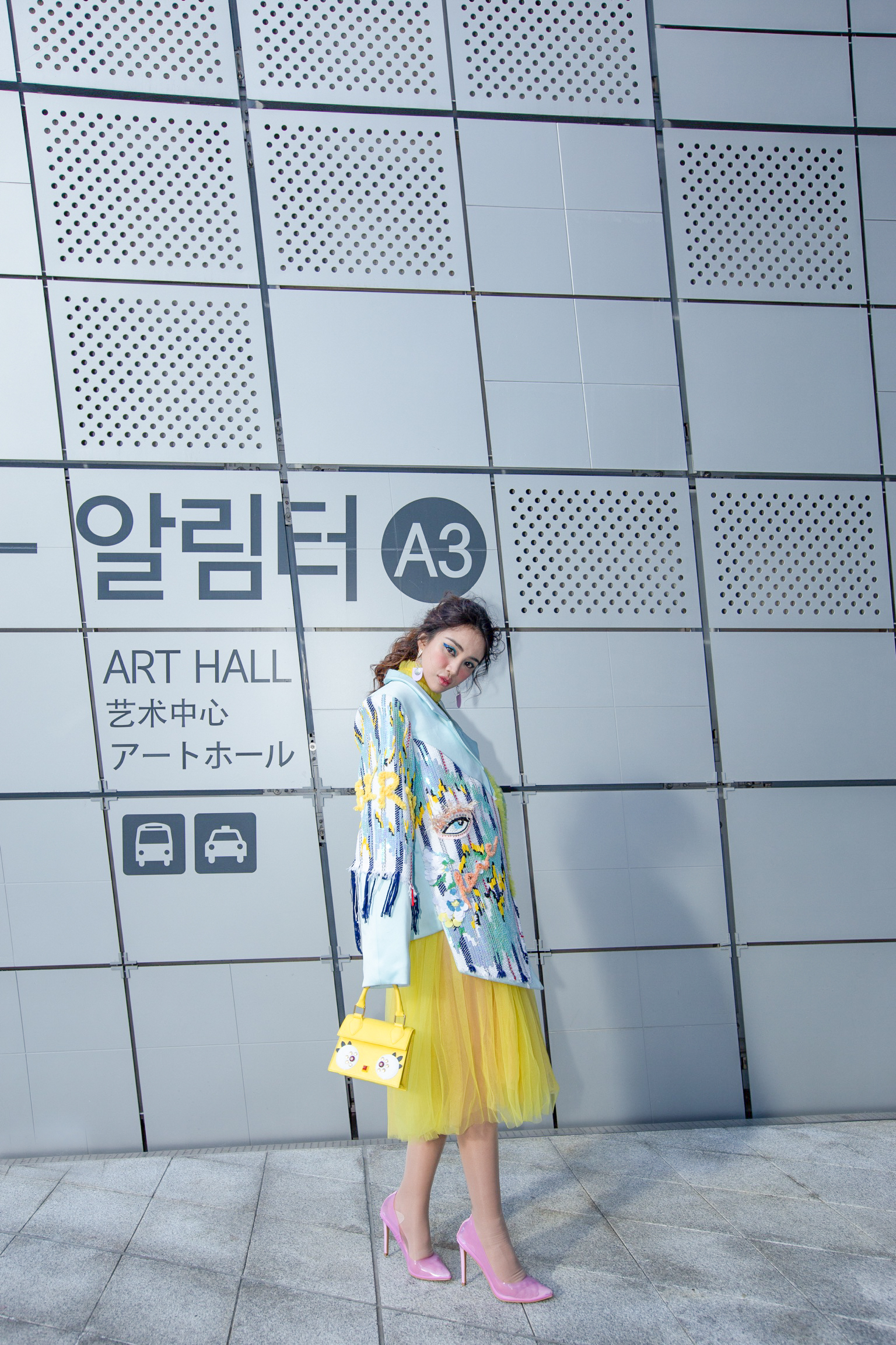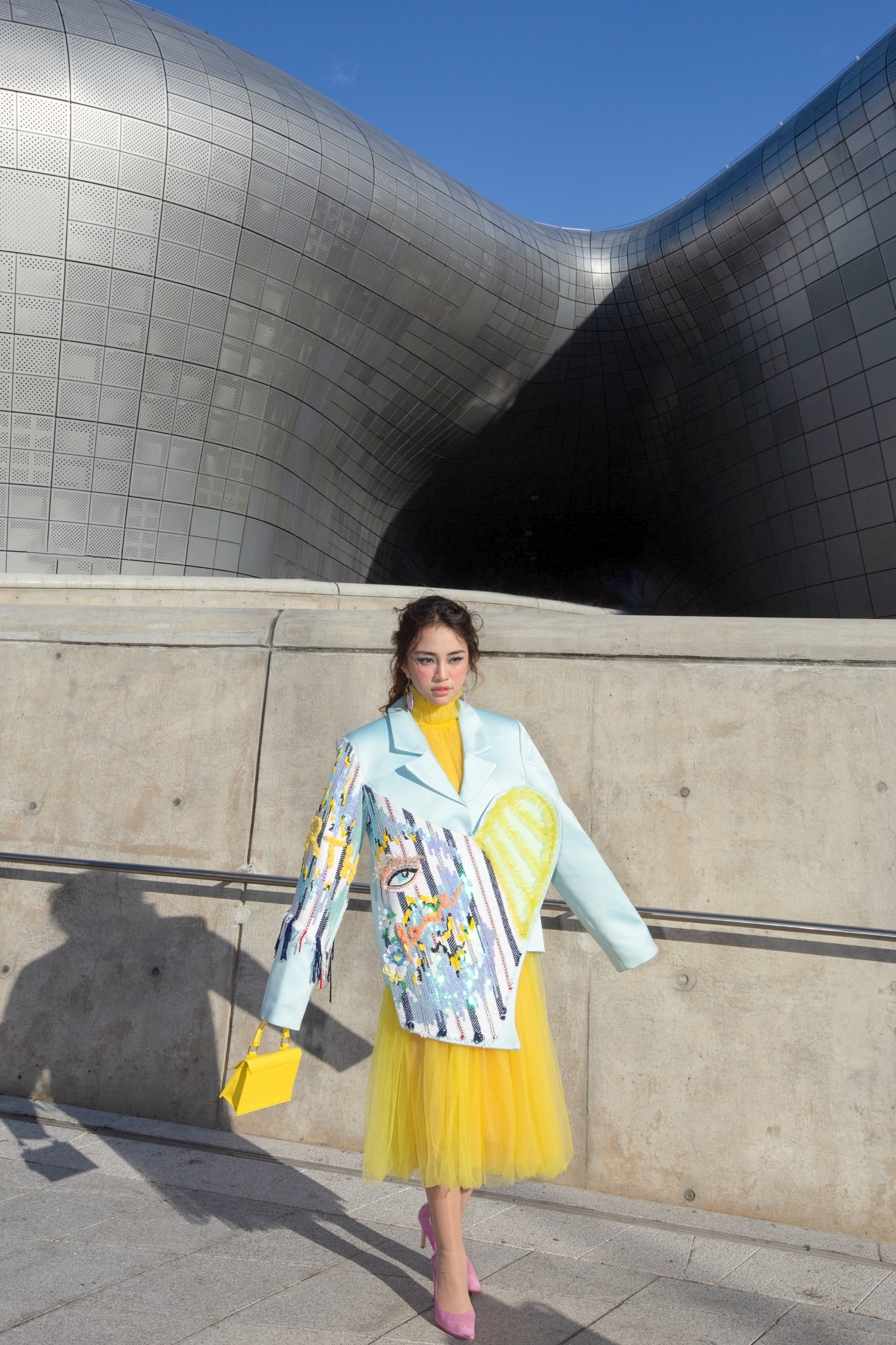 Xuất hiện tại tuần lễ thời trang Seoul, Thiên Nga The Face khiến người đối diện chẳng thể rời mắt với bộ cánh vô cùng sặc sỡ.