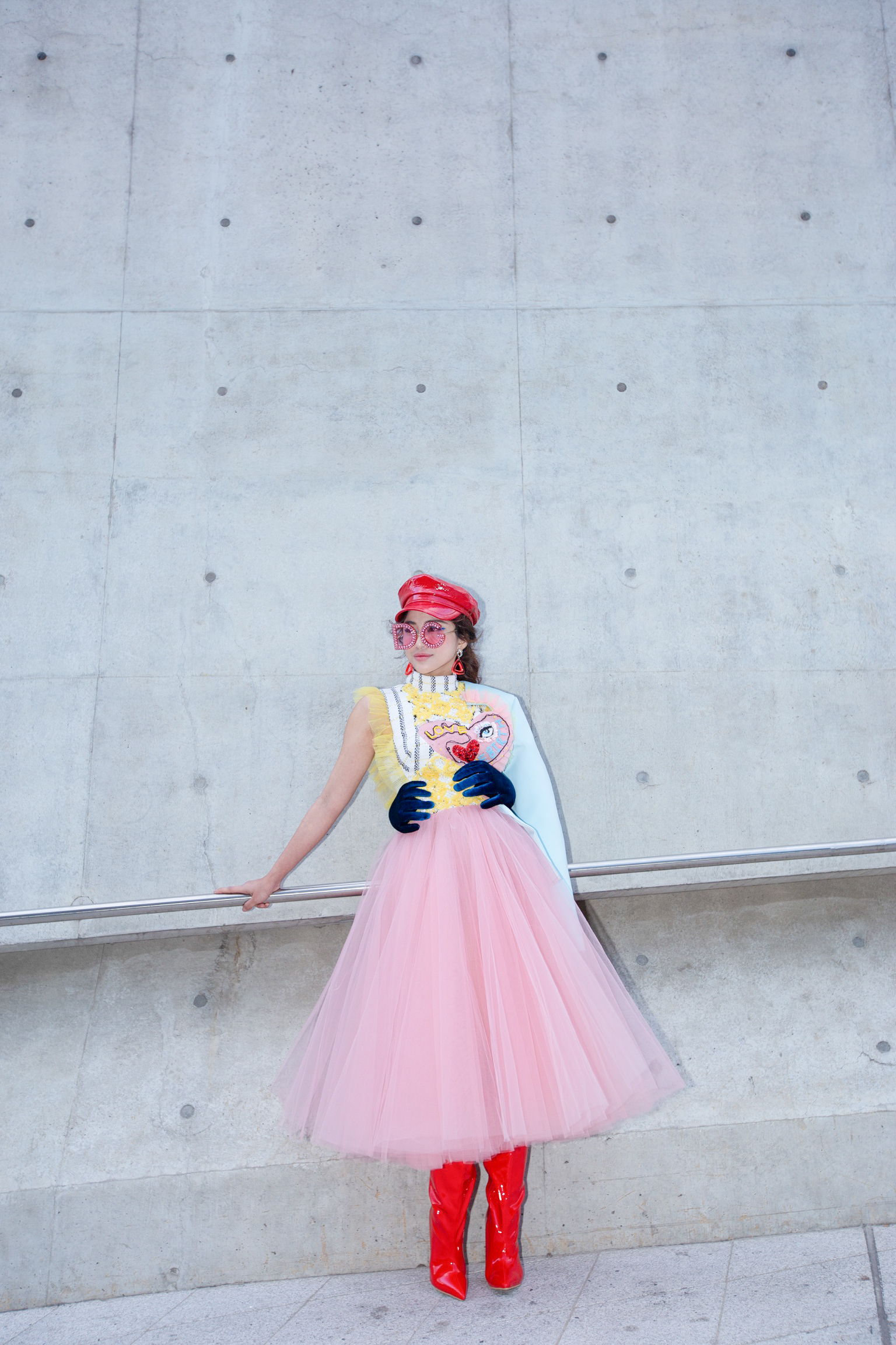 Nếu bộ đầu tiên cô chọn cách mix đồng điệu từ phụ kiện với trang phục thì chân váy hồng bồng bềnh trong look 2 mang lại hình dung như chiếc kẹo ngọt ngào.