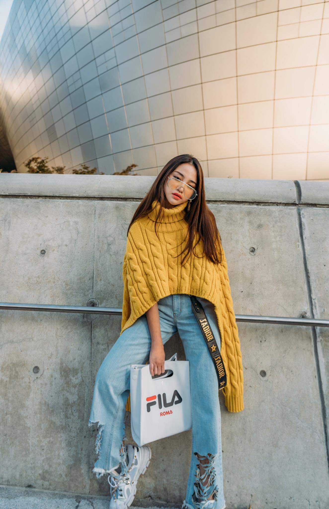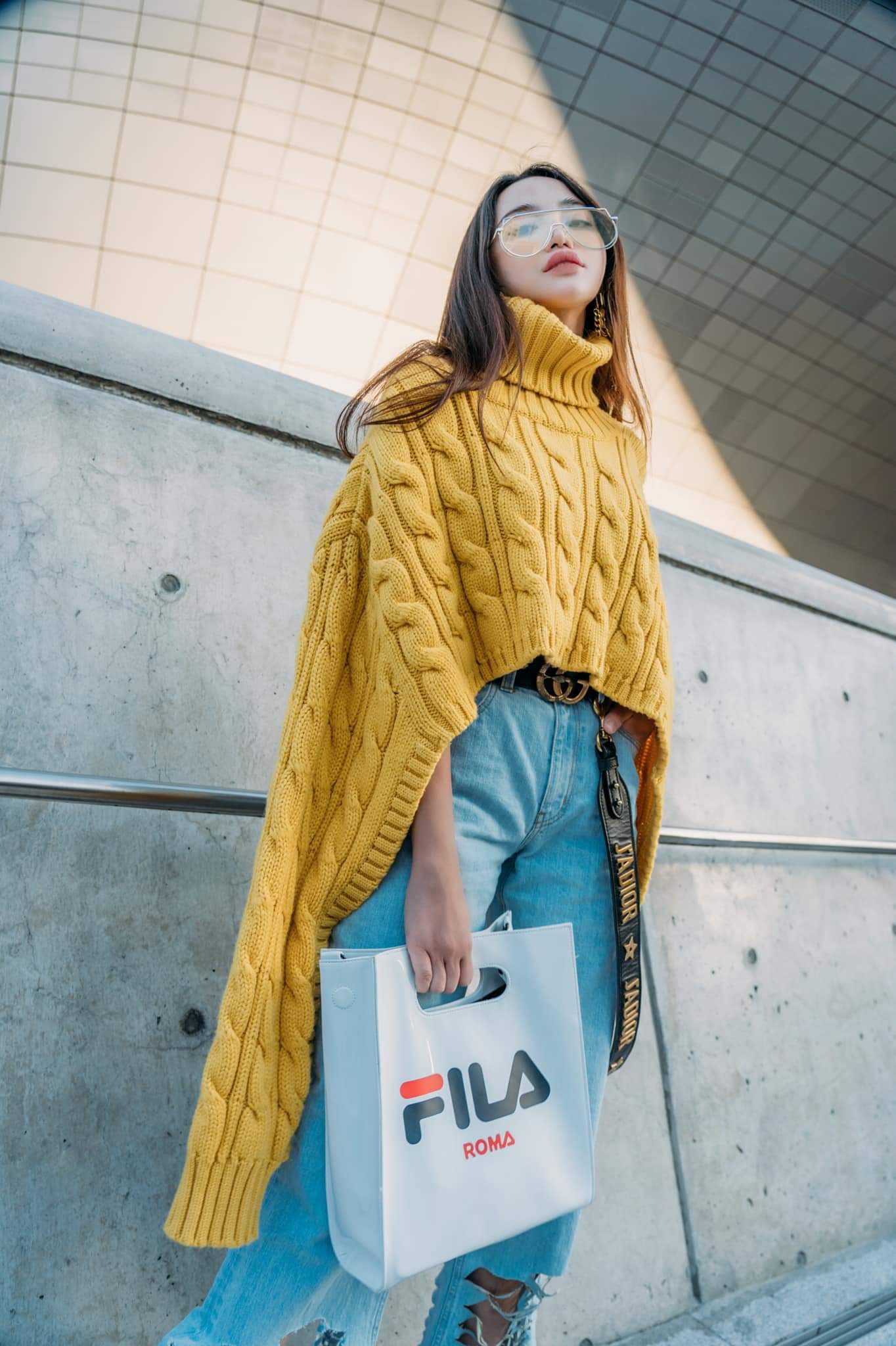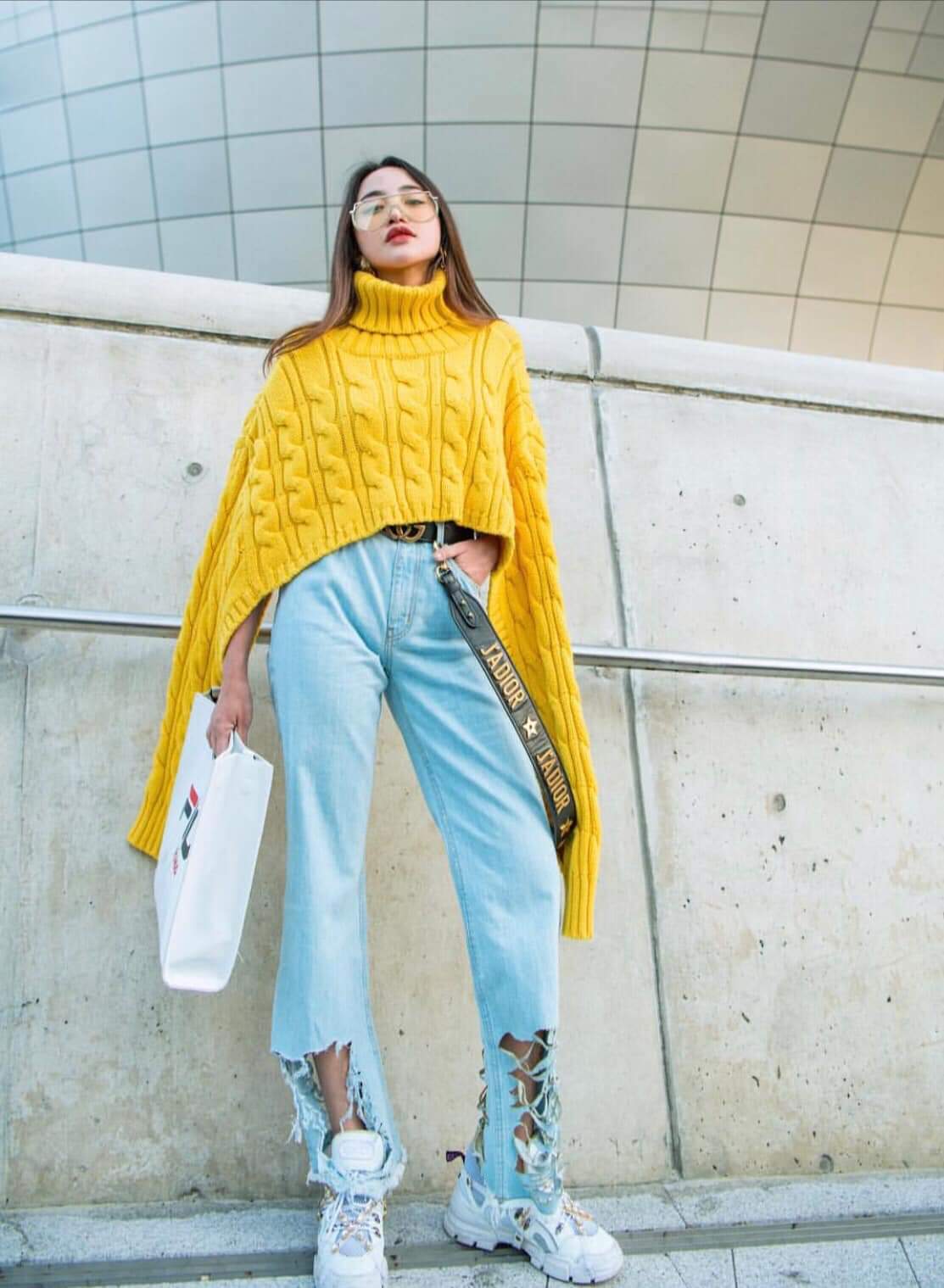 Bắt nhịp xu hướng với tông màu vàng mustard cực “hot”, Thiên Nga mix cùng quần jeans wax sáng có phần lai được xé khá bụi bặm.