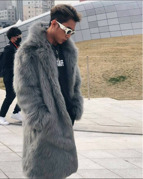 Anh chàng diện trang phục vô cùng thời thượng với áo khoác lông gam màu xám phối hợp cùng slogan tee và điểm độc đáo đến từ chiếc kính mắt ruồi của thương hiệu Versace.