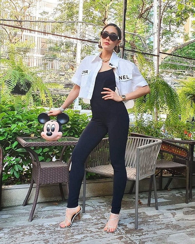 Nữ diễn viên kiêm fashionista hàng đầu xứ Thái Chompoo Araya biến hóa đa dạng khi dùng mẫu áo sơ mi trắng của mình khoác ngoài làm điểm nhấn cho set đồ đen tuyền