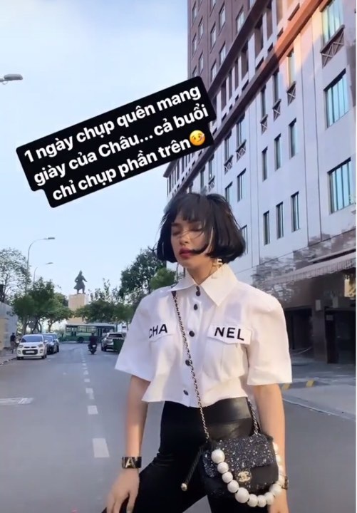 Fashionista Châu Bùi chọn kiểu áo này mix cùng quần đen ôm cùng phụ kiện túi xách Chanel trong một buổi chụp hình thời trang được cô nàng update trên stories instagram của mình