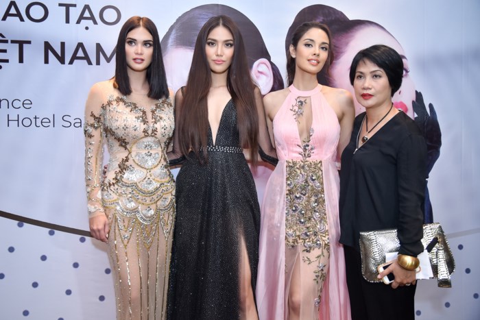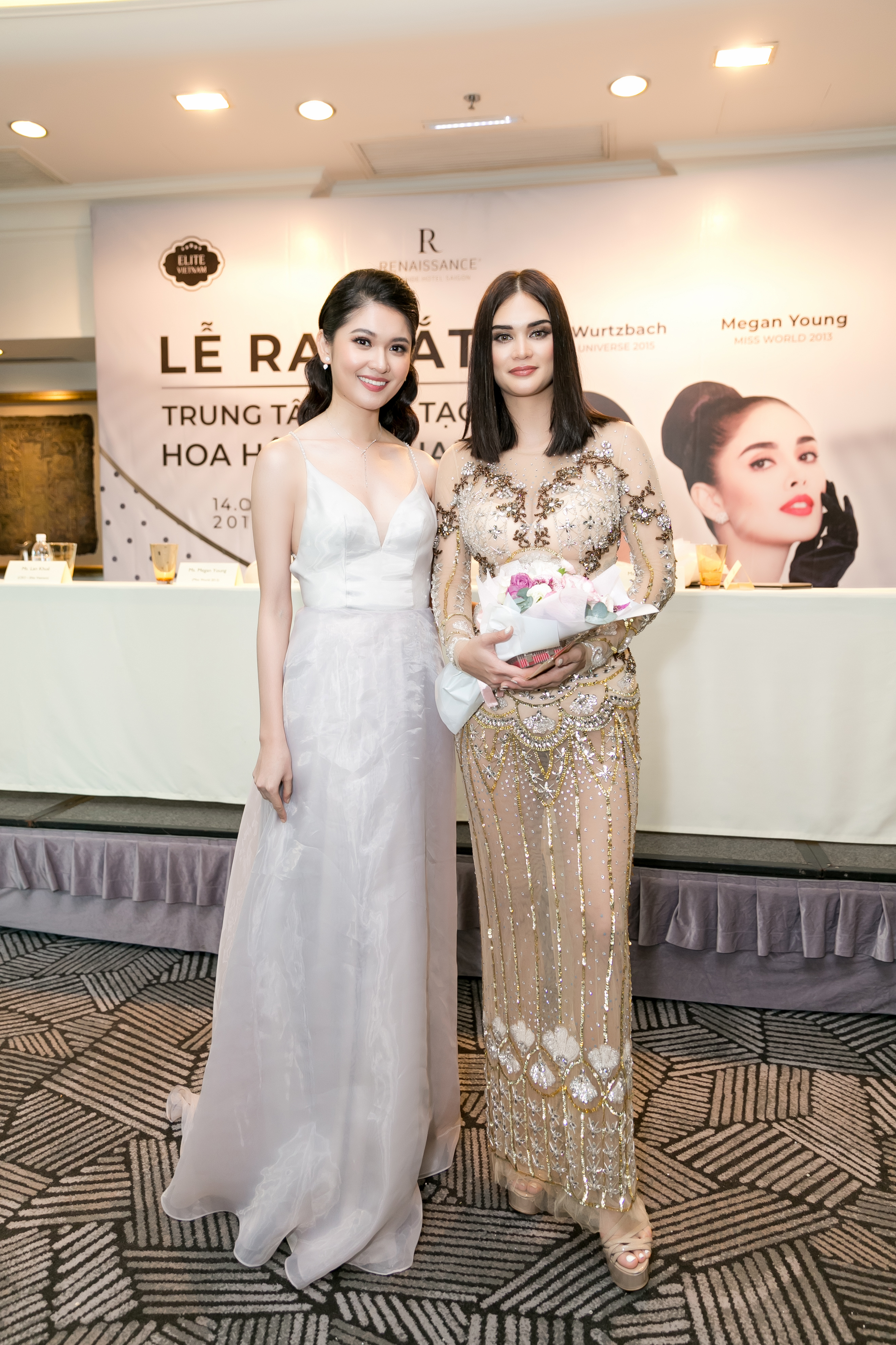 Hoa hậu Thế giới Megan Young, Hoa hậu Hoàn vũ Pia Wurtzbach và Hoa khôi Lan Khuê là tâm điểm tại sự kiện ra mắt Trung tâm đào tạo Hoa hậu Việt Nam tại TP.HCM chiều 14/4.