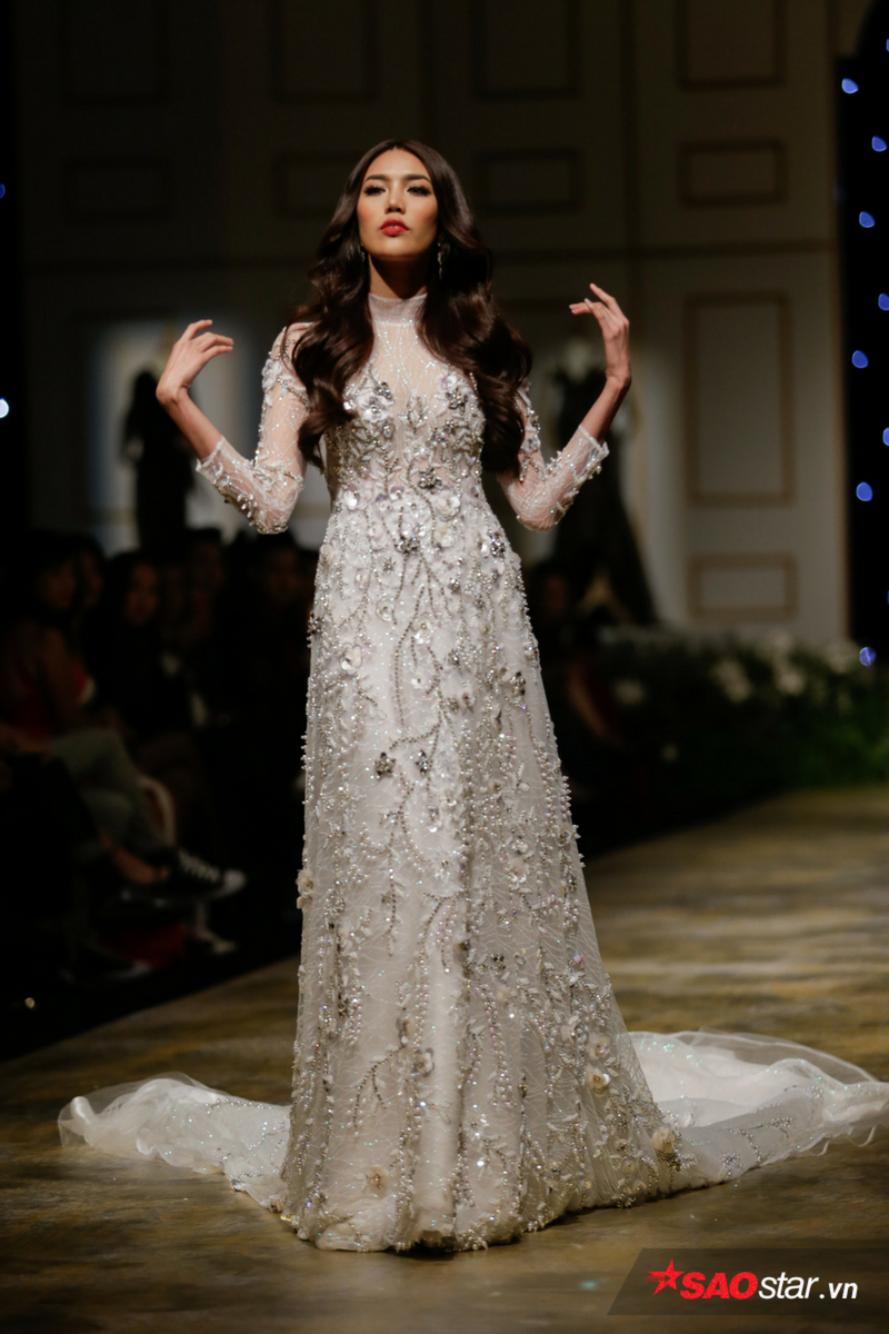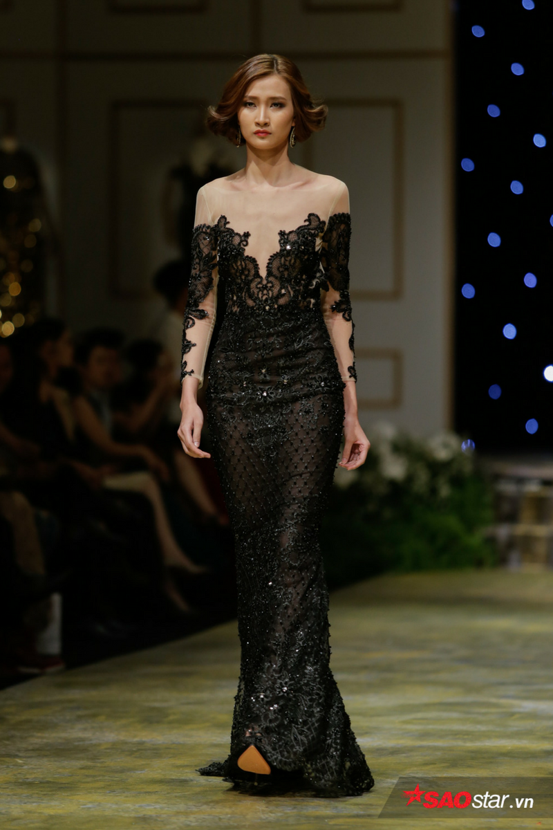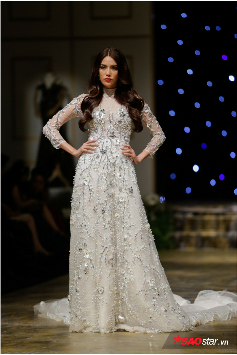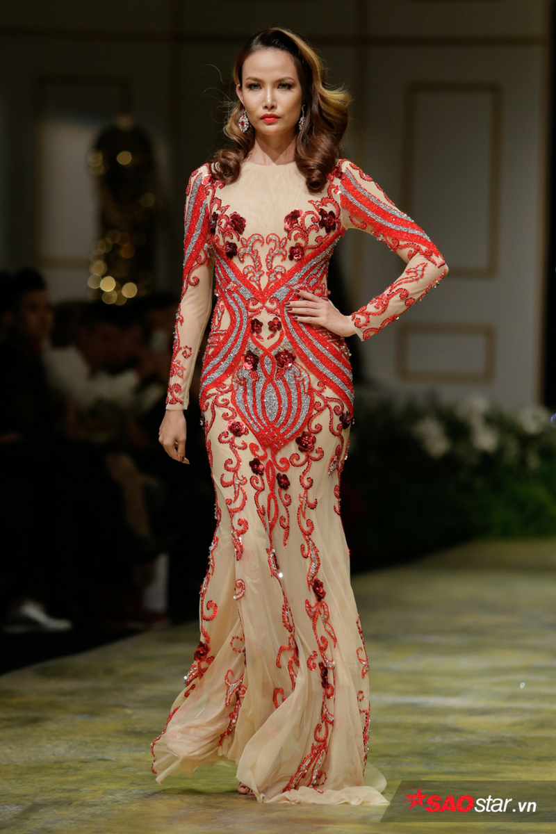 Xuất hiện với vai trò vedette trong chiếc váy được thiết kế hoa văn cầu kì với rất nhiều loại đá, cườm nặng hơn 20kg, Lan Khuê được nhận xét như một quý cô kiêu kì vô cùng sang trọng.