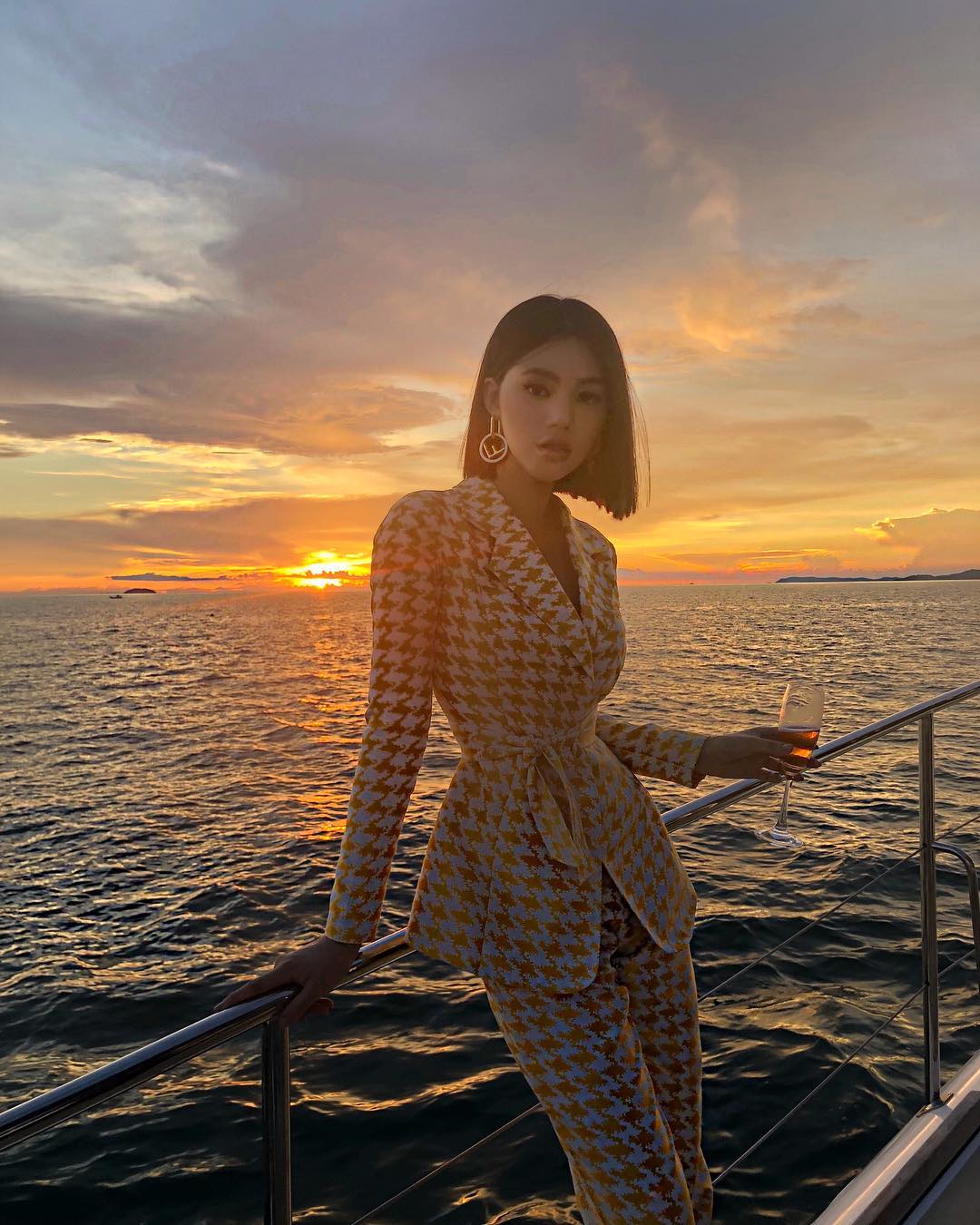 Mẫu vest với họa tiết “răng sói” đã khiến phần eo thắt đáy lưng ong của Jolie Nguyễn được tôn lên nhiều phần. Người đẹp còn sử dụng hoa tai Fendy để nâng tầm phong cách.