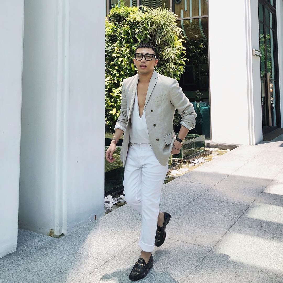 Hoàng Ku tiếp tục chứng tỏ vẻ thời thượng cùng combo áo sơ-mi, quần kaki trắng và vest. Sự lịch lãm, đàn ông là những gì người đối diện có thể cảm nhận từ phía anh chàng stylist quốc dân này.