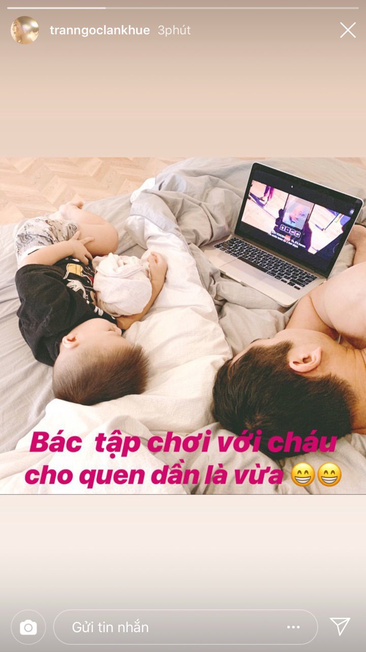 Ông xã Lan Khuê còn gây thích thú với khoảnh khắc chơi với cháu nhỏ tại nhà để tập quen trước khi đón con đầu lòng chào đời. Hình ảnh đời thường này đã được Lan Khuê ghi lại và đăng tải lên trang Instagram cá nhân kèm chú thích: “Bác tập chơi với cháu cho quen dần là vừa”.