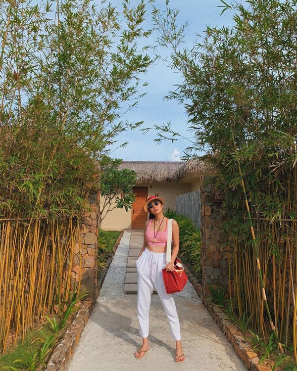 Cách sử dụng tông màu đỏ xuyên suốt từ áo đến giày cộng hưởng cùng sắc đỏ trên giàn hoa phía sau cho thấy sự tinh tế dù chỉ là để chụp một bức ảnh.