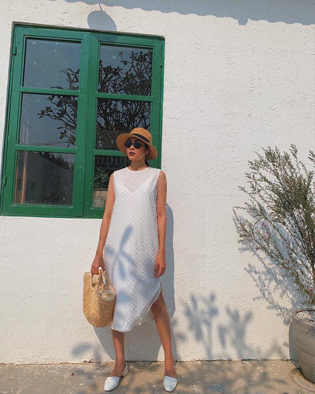 Váy suông đục lỗ làm nền cho chiếc túi cói và mũ mang đậm hơi thở mùa hè.