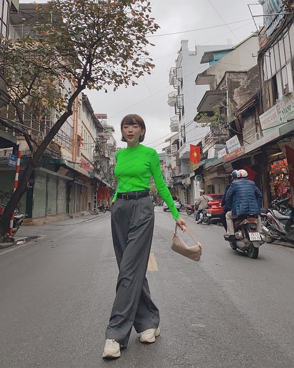 Nữ ca sĩ xinh đẹp chọn áo len cổ lọ màu xanh neon đến từ Balenciaga mix cùng quần xám ống rộng và giày thể thao hầm hố