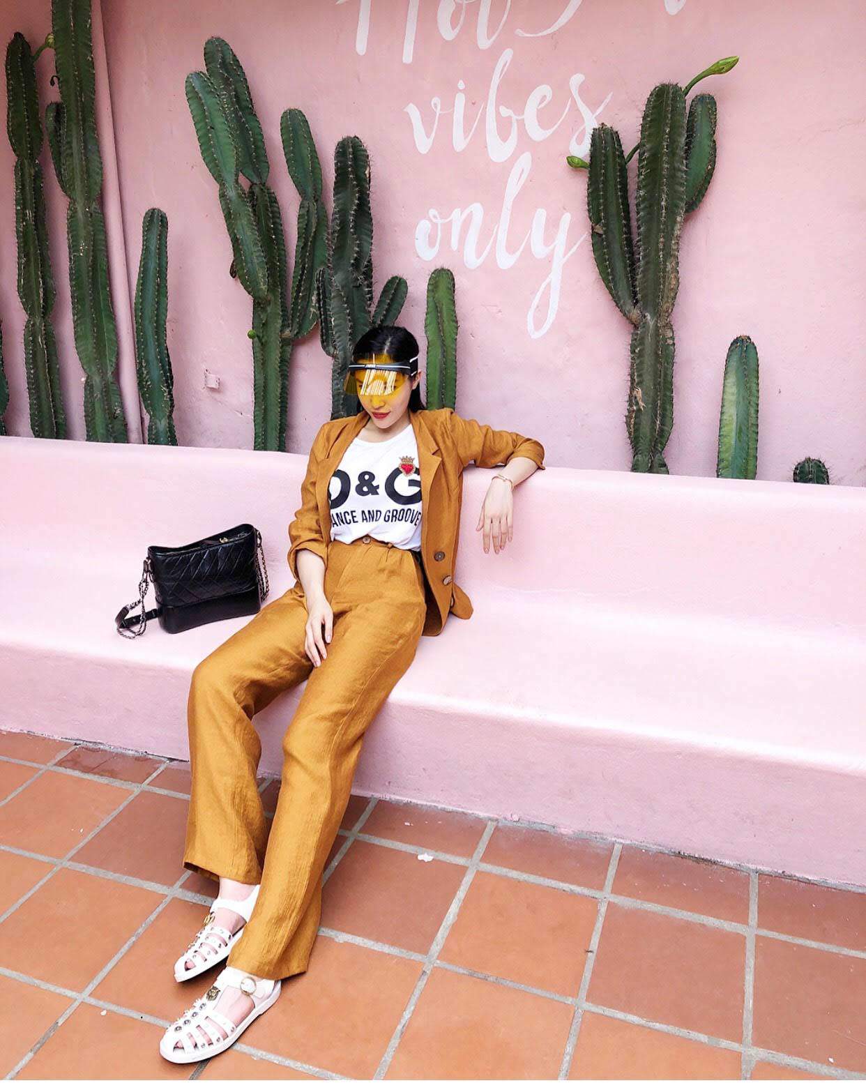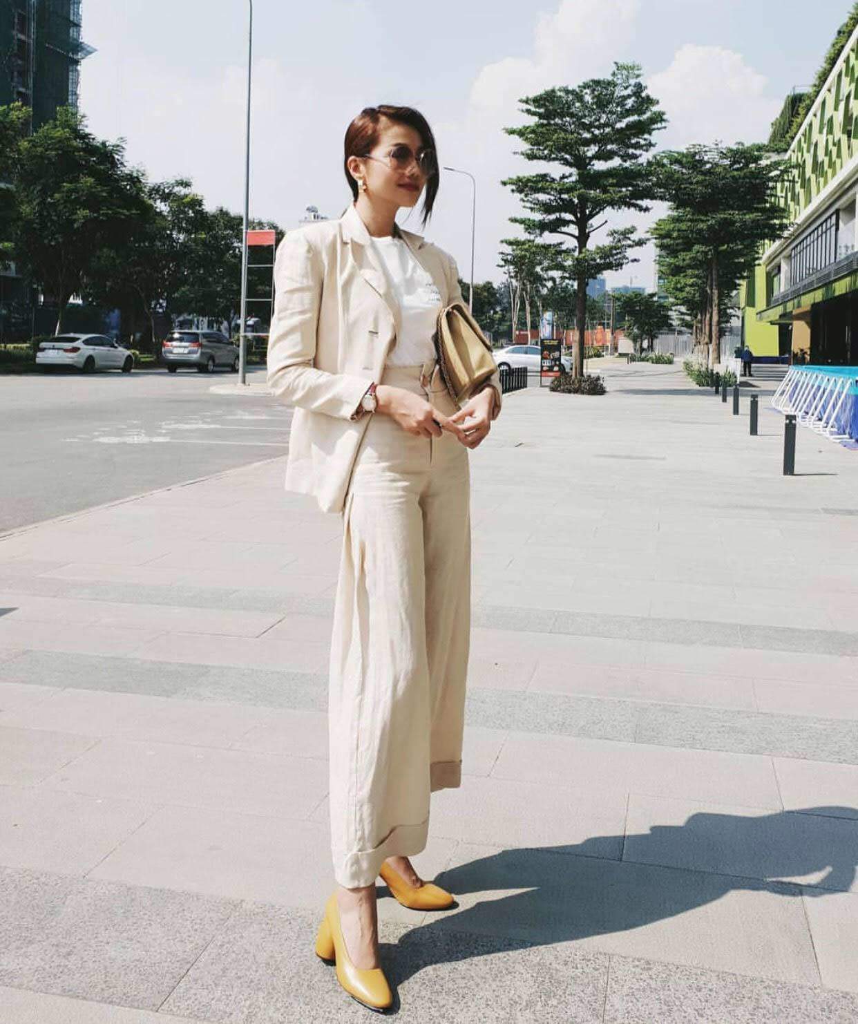 Siêu mẫu Thanh Hằng vốn là một tín đồ của phong cách thời trang, Thanh Hằng luôn chọn cho mình những set đồ blazer với sắc màu trang nhã. Chất liệu vải linen thoáng nhẹ cũng được siêu mẫu tận dụng vào bộ blazer cho thời tiết của Sài Gòn.