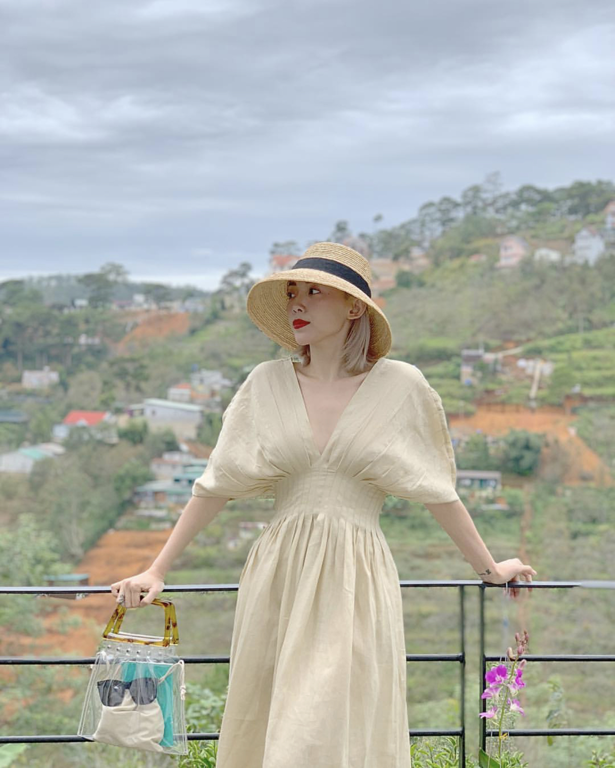 Tóc Tiên cũng không bỏ lỡ cuộc chơi này, chiếc váy màu tan từ vải linen được Tóc Tiên khéo léo phối cùng những phụ kiện mùa hè như mũ cối và túi trong suốt.