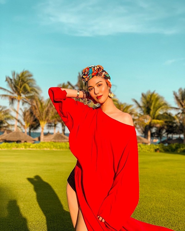 Lan Khuê đầy sang chảnh và một chút hoang dã với kiểu quấn khăn turban kiểu đội đầu mix cùng kiểu váy đỏ oversized lệch vai