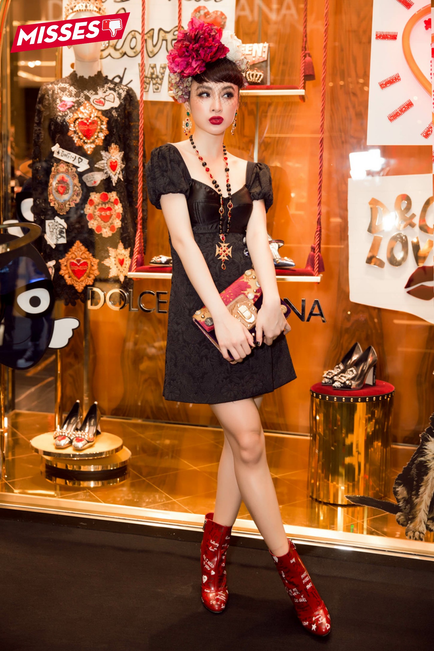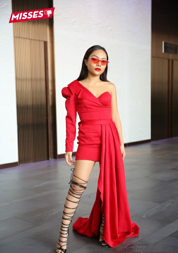 Vũ Thảo My lại khiến nhiều người thất vọng với bộ cánh có phần vải lệch tà dư thừa và rối rắm. Gam màu đỏ từ trên xuống cũng khiến cho nữ ca sĩ trở nên quê mùa. Đôi giày buộc dây là điểm trừ lớn nhất khi nó góp phần “tố cáo” khuyết điểm hình thể của quán quân The Voice mùa đầu tiên.