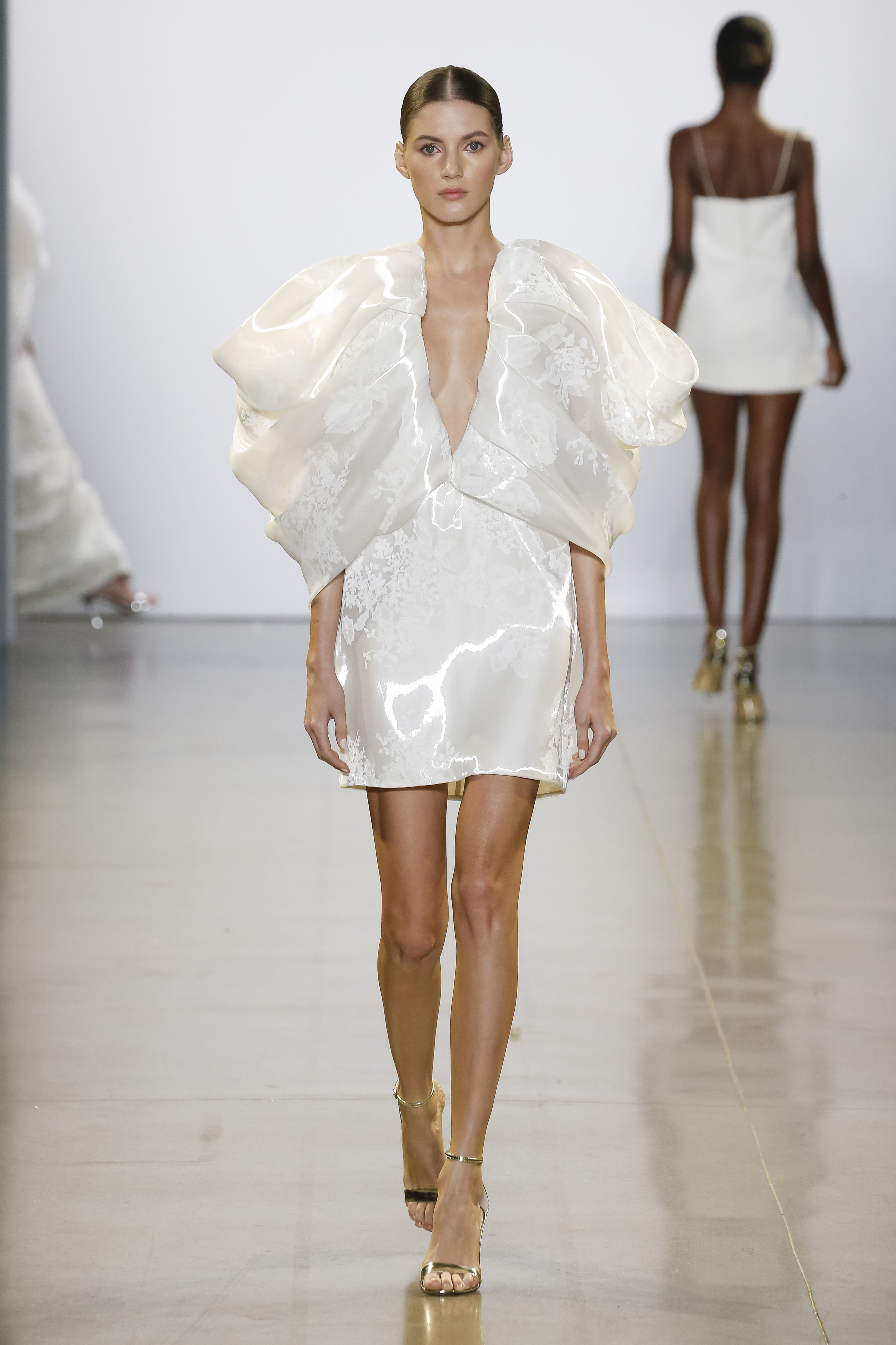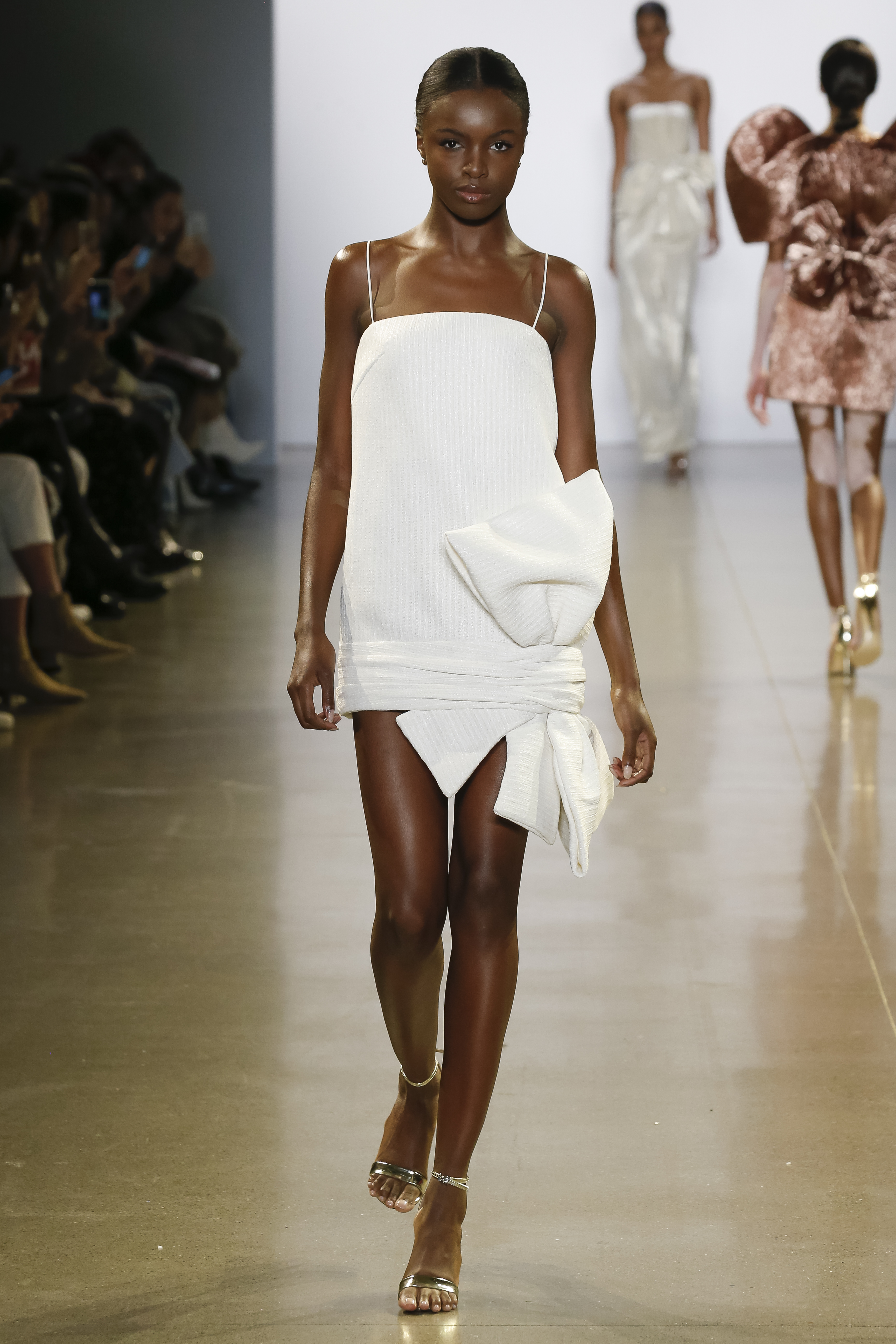 Nhiều thiết kế sử dụng kỹ thuật draping, dựng phom dáng 3D tạo nên những chiếc nơ với các cấu trúc hình khối chuyển động uyển chuyển khi model trình diễn.