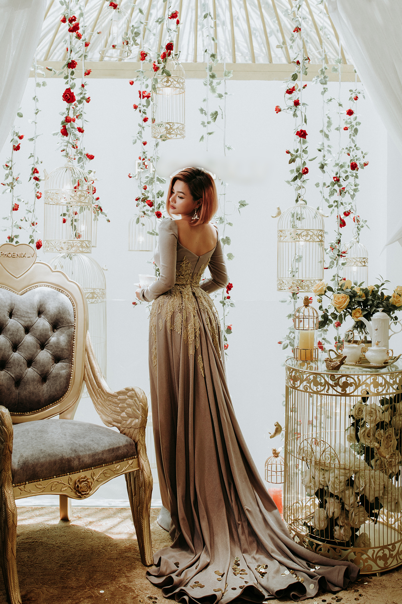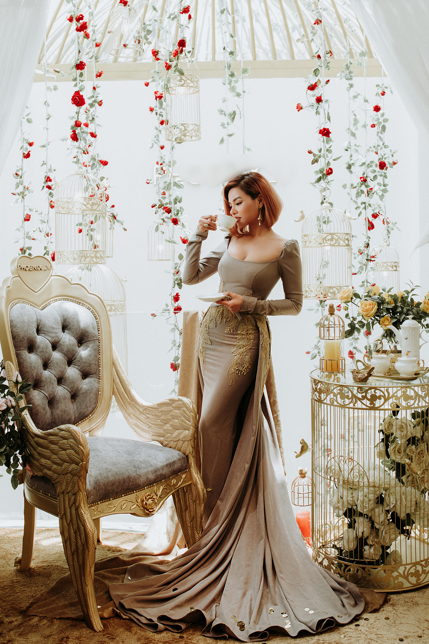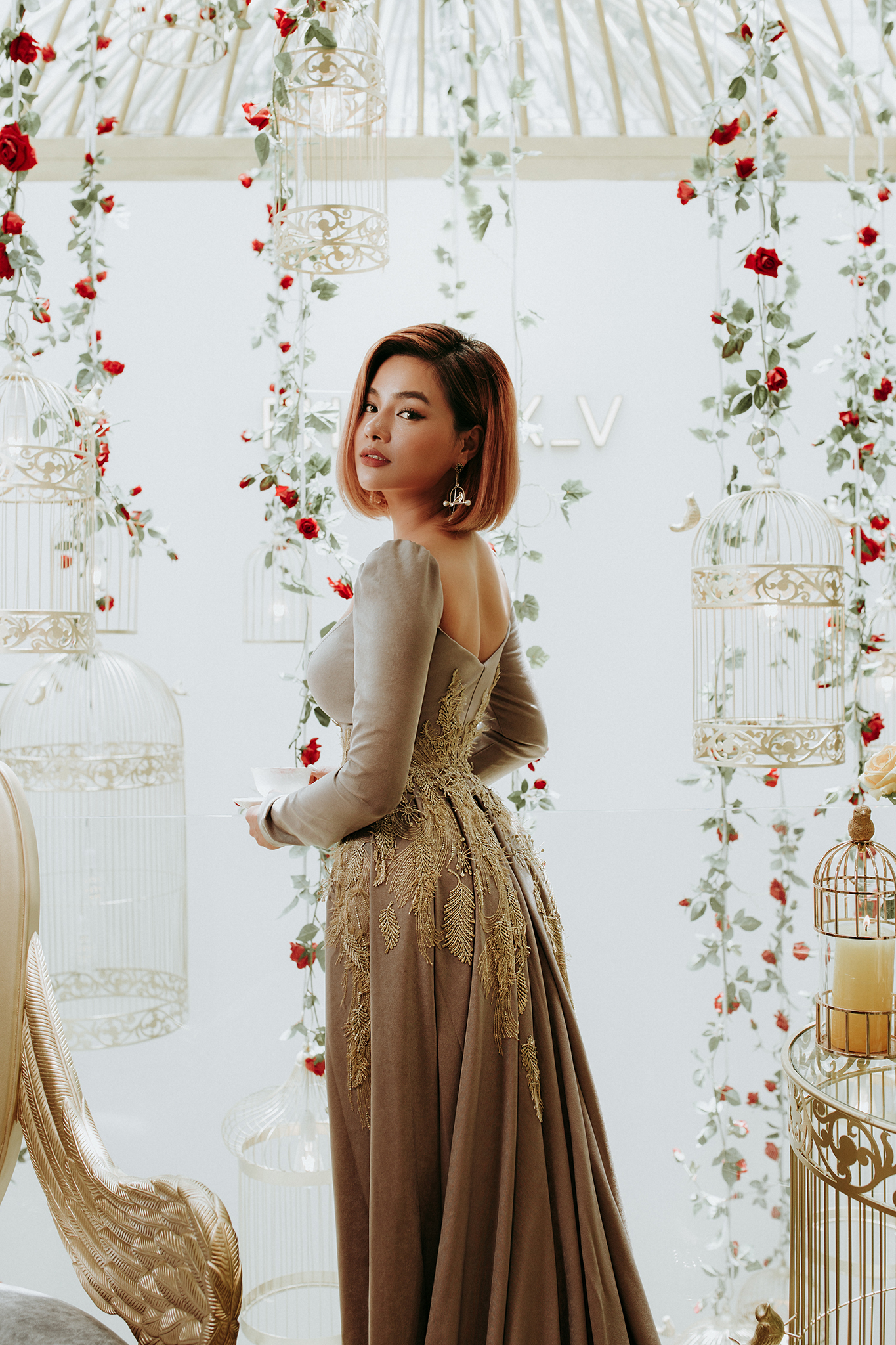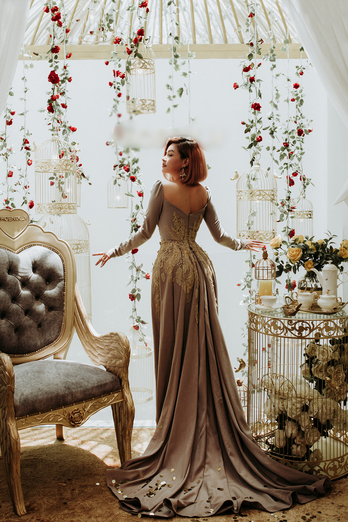 Một thiết kế khác đậm chất Hoàng gia Châu Âu với phần cổ vuông khoét sâu khoe vòng 1 căng đầy của người mặc.