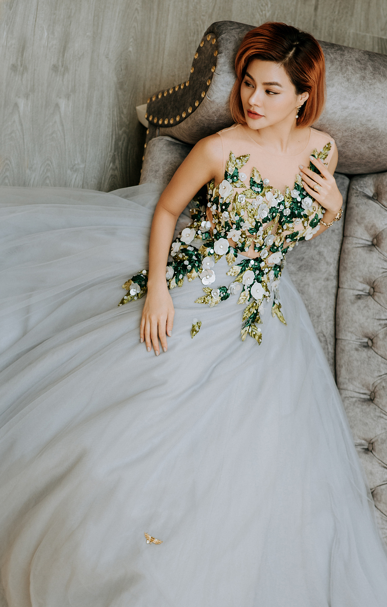 Trong một thiết kế khác cô nhấn nhá vào phần ngực với những phần kết hoa 3D dày đặc. Để giảm độ nặng nề và rườm rà, Vũ Thu Phương đã để phần tùng váy trơn xõa.