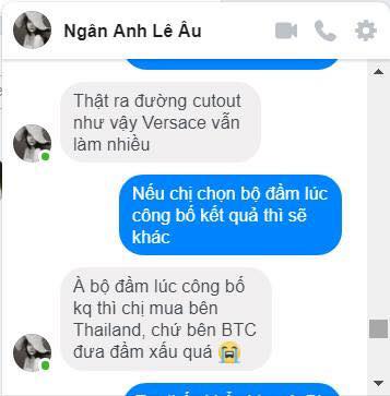 Đoạn tin nhắn của Ngân Anh chê bai chiếc váy của ban tổ chức xấu quá nên không mặc