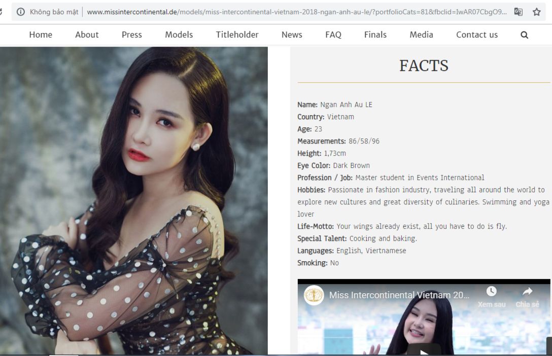 Hình ảnh chính thức của Lê Âu Ngân Anh trên trang chủ cuộc thi Miss Intercontinental 2018.