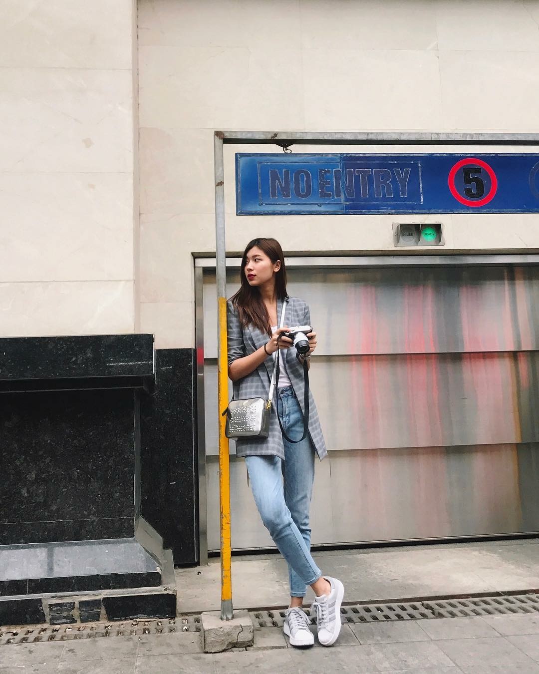 Đồng Ánh Quỳnh mix áo trắng và blazer kẻ sọc thần thánh để tạo hiệu ứng set đồ nhiều layout hơn.