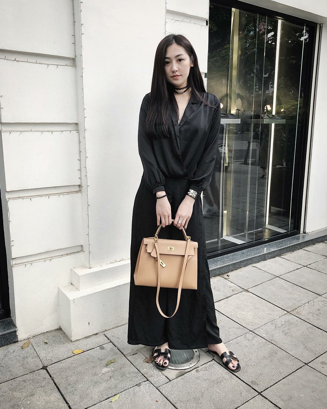 Dương Tú Anh thùy mị trong chiếc váy maxi đơn sắc full đen cùng túi xách màu be to bản khá cổ kính.
