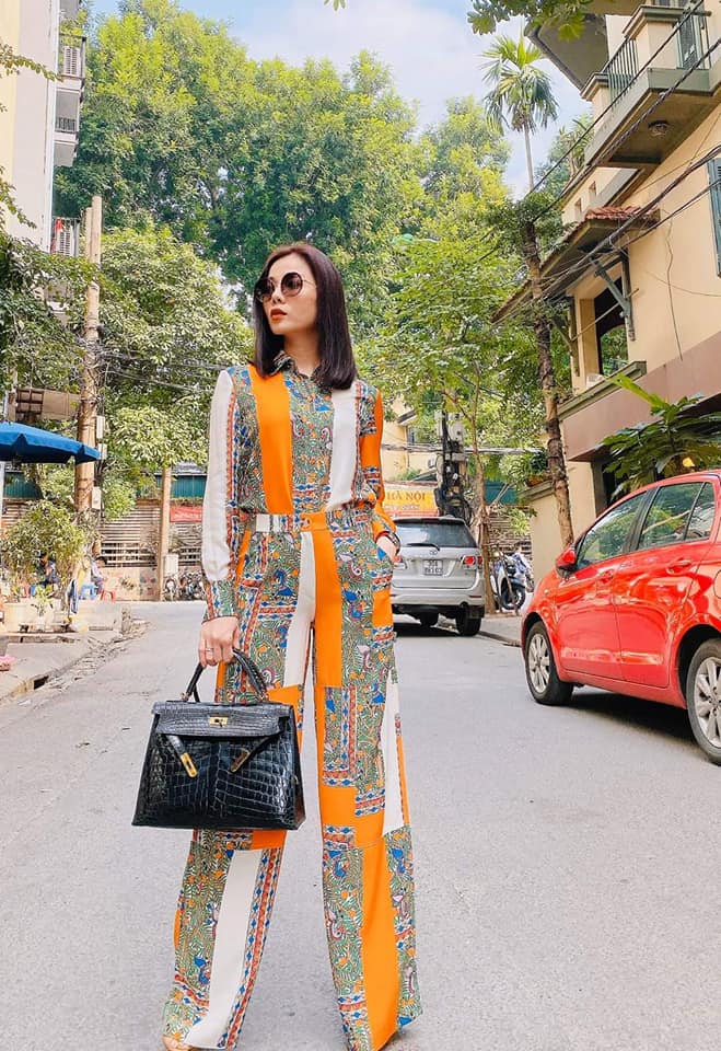 Hình thể nuột nà với dáng quần lụa Louis Vuitton mix cùng áo crotop màu cam đất khiến giọng ca sinh năm 1981 nổi bần bật