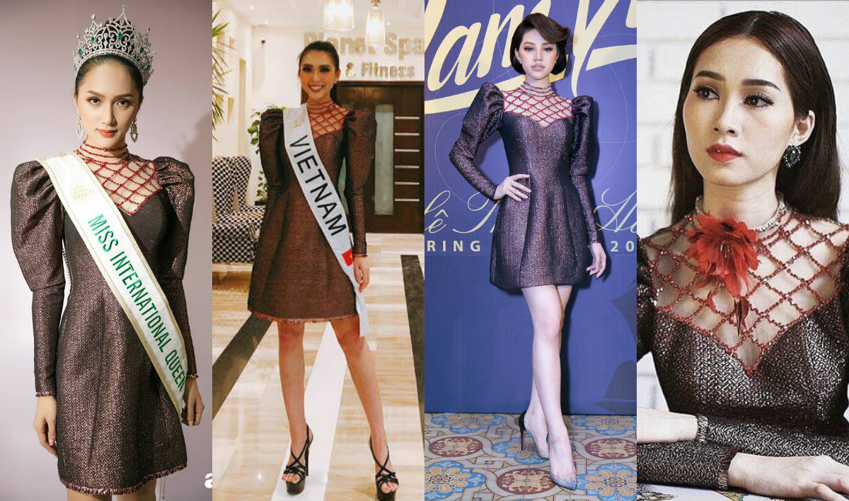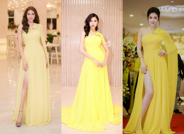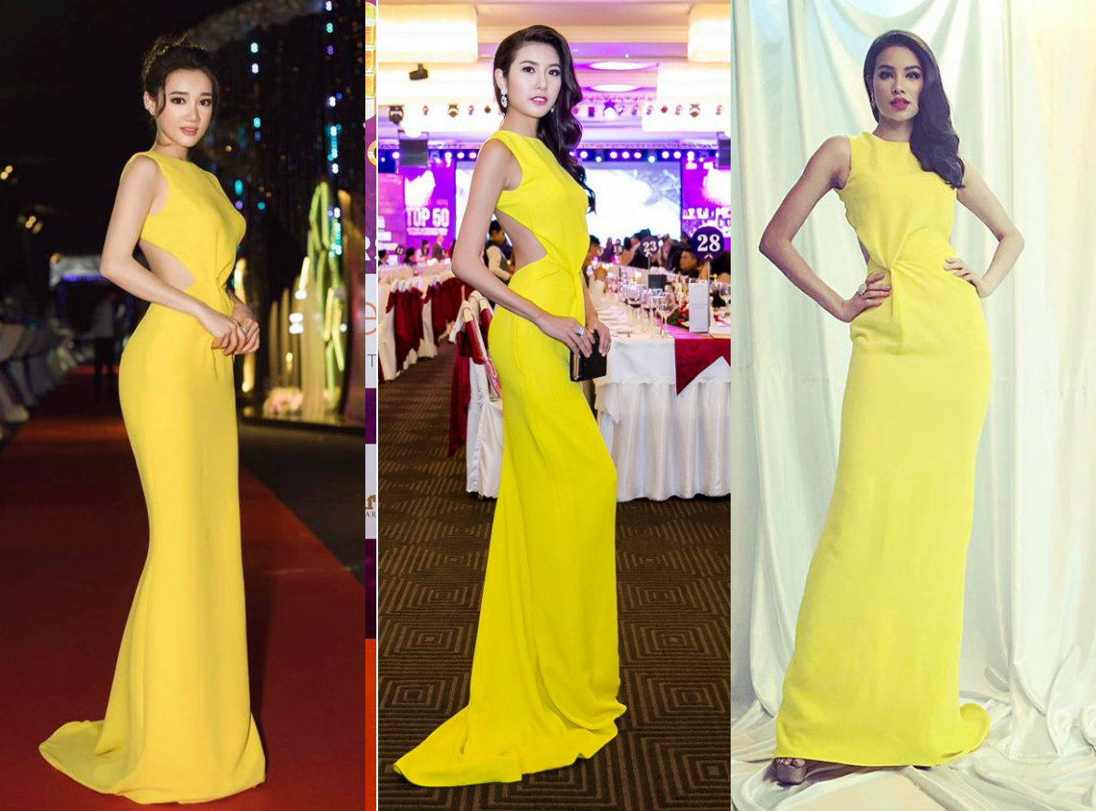 Trong một thời gian ngắn, thiết kế váy dạ hội màu vàng chanh này đã được 3 nàng hậu đình đám thay phiên nhau xuất hiện tại các sự kiện. Phạm Hương là người “mở hàng” đầu tiên và tiếp sau đó đến á hậu Tú Anh và Á hậu Quốc tế Thúy Vân.