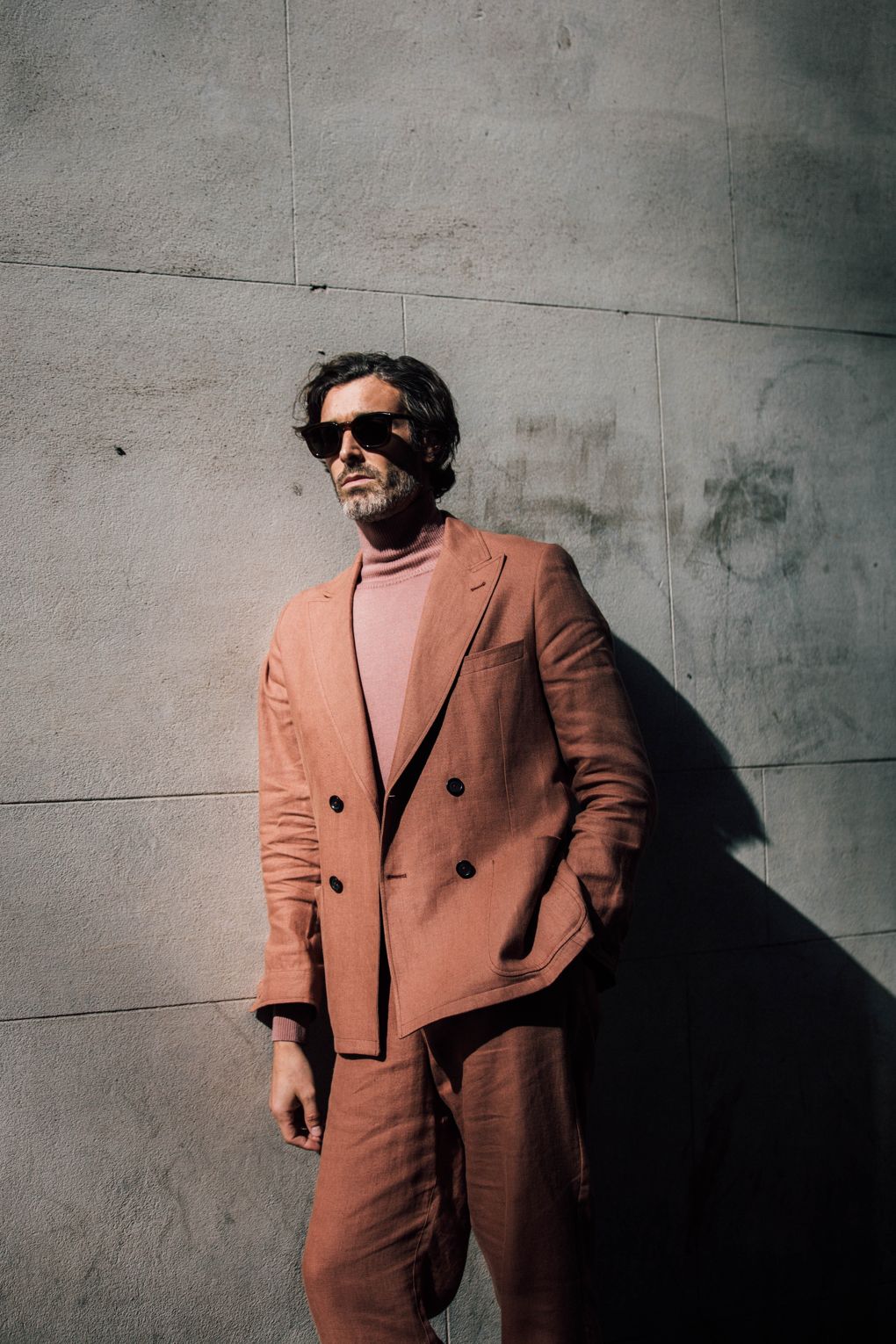 Chiếc áo cổ lọ gam màu trầm hợp với bộ suit là yếu tố khiến quý ông cá tính và thời trang hơn.