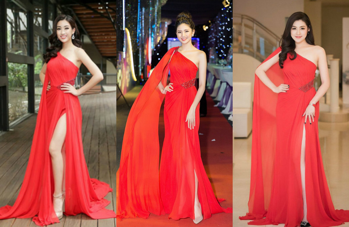 Lần đầu tiên có một thiết kế được cả bộ ba hoa hậu, á hậu Việt Nam thay phiên nhau diện. Đây quả là màn đụng hàng “có một không hai” từ trước tới nay. Thật khó để phân thắng bại, bởi mỗi người đều có một thần thái riêng biệt. Nhưng có lẽ trong bức ảnh này Đỗ Mỹ Linh bị “dìm hàng” nhẹ so với hai nàng á hậu. Bởi trông như chân cô bị ngắn đi rất nhiều.