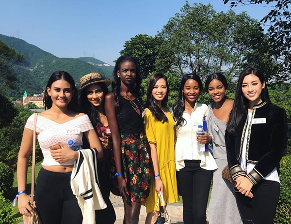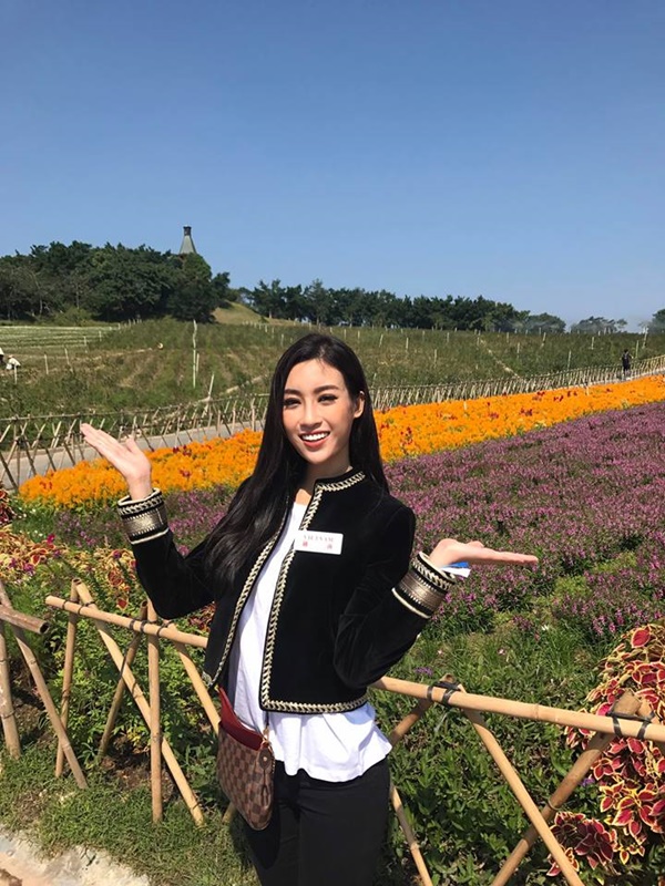 Tham gia một hoạt động ngoài trời đầu tiên trong khuôn khổ Miss World, Mỹ Linh mặc áo thun trắng cùng quần đen đơn giản, chiếc áo nhung đen khoác ngoài họa tiết ánh kim làm điểm nhấn cho cả set đồ. Bộ trang phục khá phù hợp cho hoạt động ngoài trời nhưng có phần thiếu đẳng cấp của một hoa hậu.
