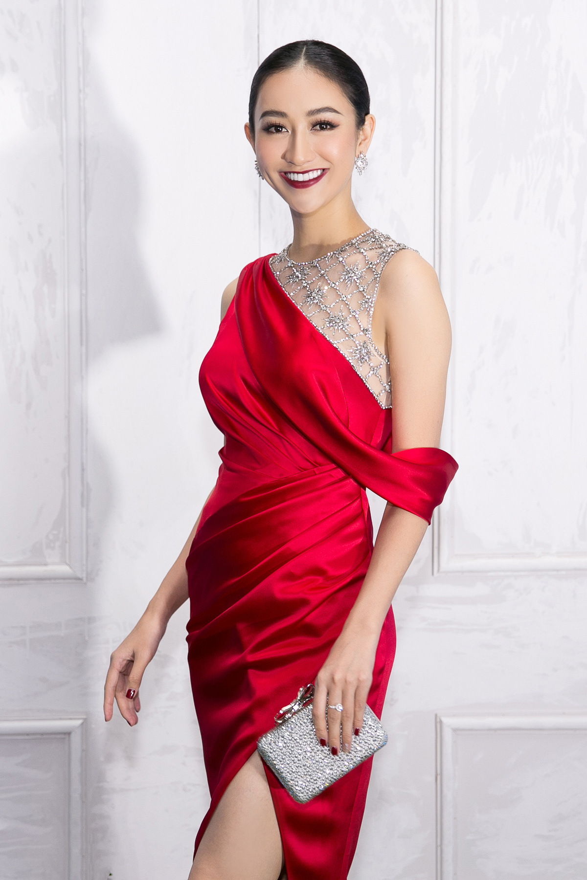 Trong khi đó, hoa hậu Đỗ Mỹ Linh vốn trung thành với những gam màu nhã nhặn bất ngờ xuất hiện với bộ đầm nữ tính gam màu đỏ bắt mắt. Diện thiết kế khoe vai trần duyên dáng, người đẹp Hà thành chọn tông trang điển sắc nét cùng mái tóc suông trẻ trung.