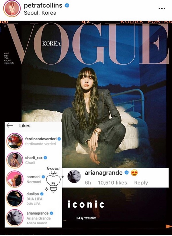 Loạt ngôi sao hàng đầu Hollywood như Ferdinando Verderi - Giám đốc sáng tạo của Vogue Italia, Ariana Grande, Dua Lipa, Normani, Charli XCX và nhiều nghệ sĩ khác đã like ảnh Lisa chụp cho Vogue Korea