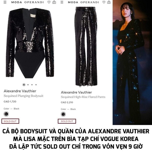 Đúng là sức hút không đùa được khi chỉ mới “nhá nhem” thông báo sẽ ra mắt dòng thời trang mang tên riêng mà “búp bê Thái Lan” đã khiến hàng triệu fans mong chờ ngày đêm. Lisa Black Pink lại tiếp tục khiến các khán giả phải ngỡ ngàng khi diện nguyên set đồ đen lấp lánh đến từ thương hiệu Pháp cao cấp Alexandre Vauthier và chỉ sau vài tiếng khi tạp chí Vouge Korea tung hình và hậu trường clip, nguyên cây đồ đã trong tình trạng “sold out” toàn tập trên web.