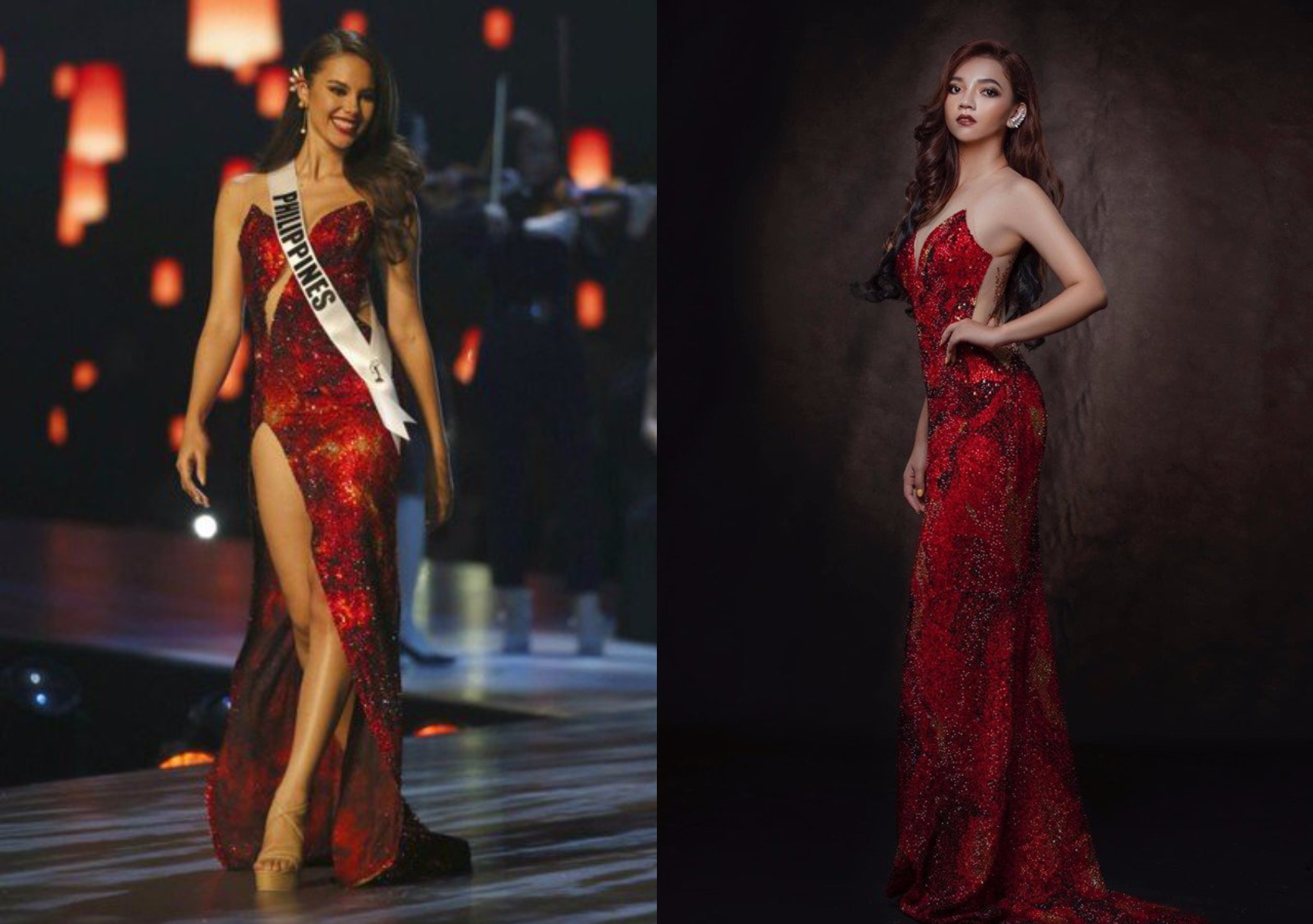 Một trong nhũng thiết kế ở Miss Universe bị đạo nhái nhiều nhất đó chính là chiếc váy núi lửa phun trào của Catriona Gray. Góp mặt trong danh sách này, có lẽ Lê Âu Ngân Anh là cái tên dẫn đầu. Trong đêm chung kết Miss Intercontinental 2018 đại diện Việt chiếm spotlight khi diện chiếc đầm được cho là “học hỏi” từ mỹ nhân Philippines.