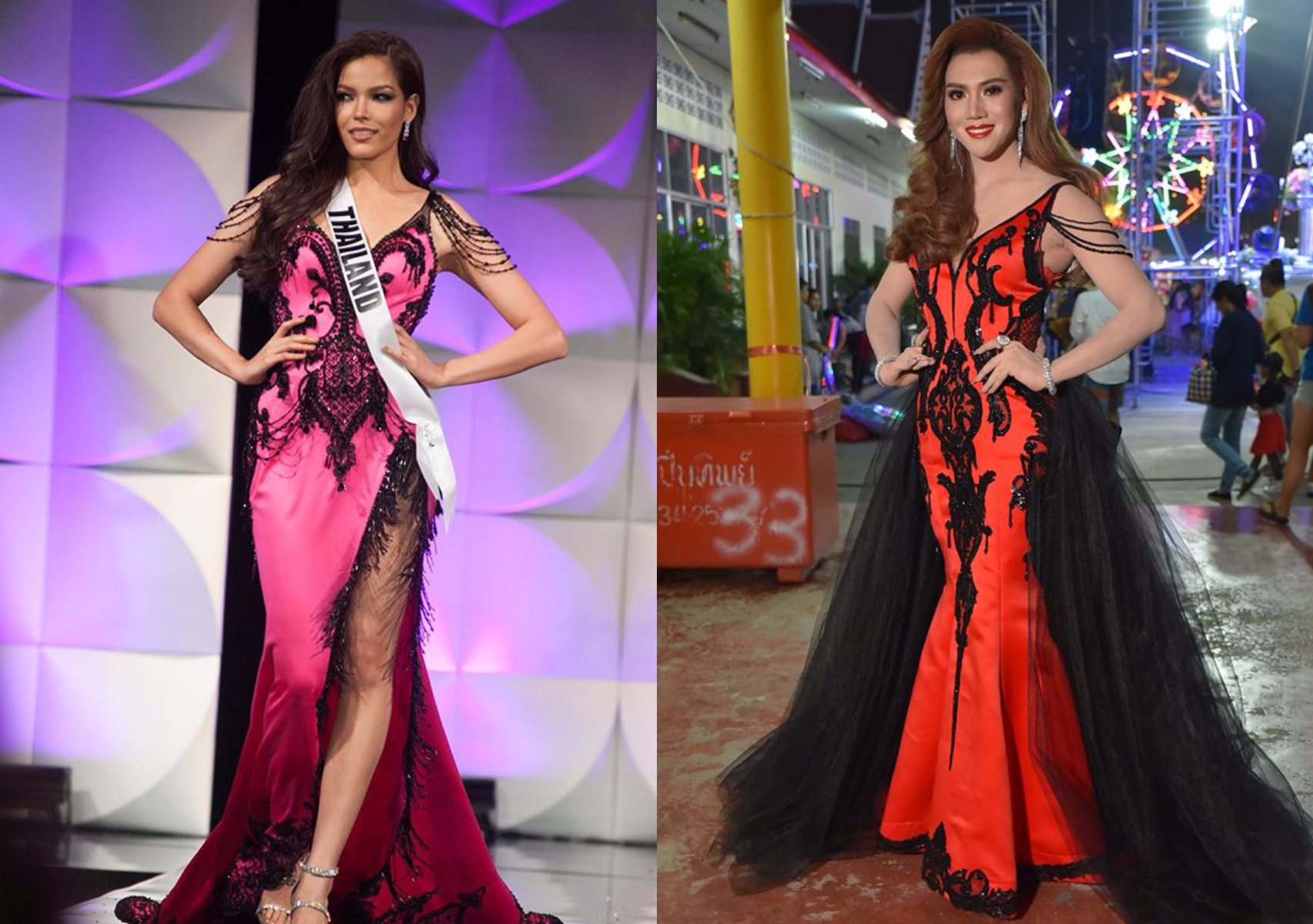 Mới đây nhất là chiếc váy của Hoa hậu Hoàn vũ Thái Lan Paweensuda Drouin đã bị một thí sinh chuyển giới nước này đạo nhái lại. Được biết chiếc váy hồng của top 5 Miss Universe diện trong đêm bán kết và vấp phải nhiều ý kiến chê bai dữ dội, mặc dù vậy thí sinh chuyển giới này vẫn “remake”, hòng gây sự chú ý của khán giả.