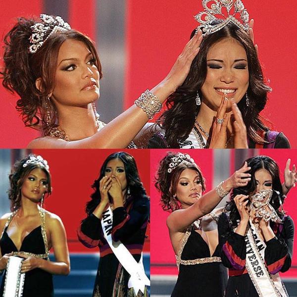 Tại đêm chung kết Miss Universe 2007, ngoài sự lên ngôi của người đẹp đến từ đất nước mặt trời mọc - Riyo Mori, thì khoảnh khắc cô nhận được vương miện từ người tiền nhiệm cũng là một điểm nhấn trong thời khắc quan trọng ấy.