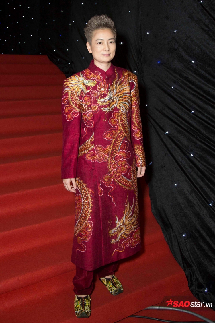 Cựu người mẫu Thúy Vinh gây ấn tượng với bộ cánh rồng phượng cùng đôi hài ton-sur-ton. Mặc dù vậy, chất liệu quá cứng, nuốt dáng cũng khiến cô phải nhận lấy những cái lắc đầu ái ngại từ phía người hâm mộ.
