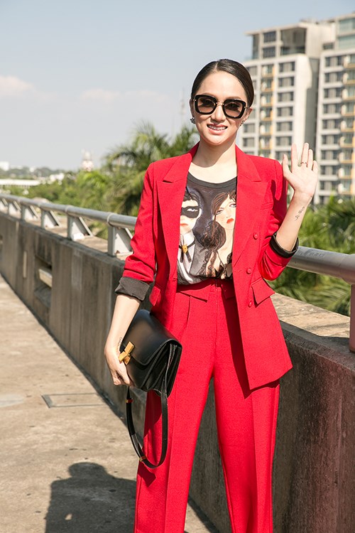 Lên đường ra nước ngoài chinh chiến tại cuộc thi, Hương Giang mặc cả cây vest đỏ rực nổi bật tại sân bay.
