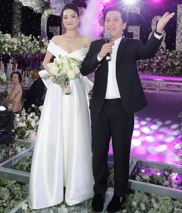 Trong tiệc cưới của mình, Nhã Phương cũng không quên chọn cho mình chiếc váy cưới trễ vai phô diễn thềm ngực đầy và xương quai xanh gợi cảm sánh vai cùng anh chồng Trường Giang