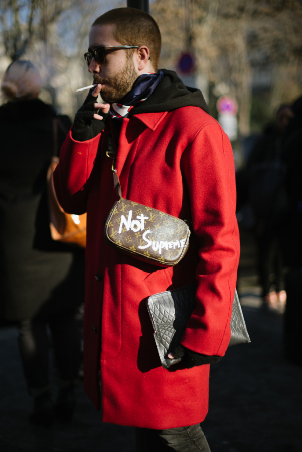 Chàng trai gây ấn tượng với cánh săn ảnh nhờ vào mẫu áo khoác tông đỏ nổi bật kèm theo chiếc túi xách cùng khẩu hiệu Not Supreme độc đáo.
