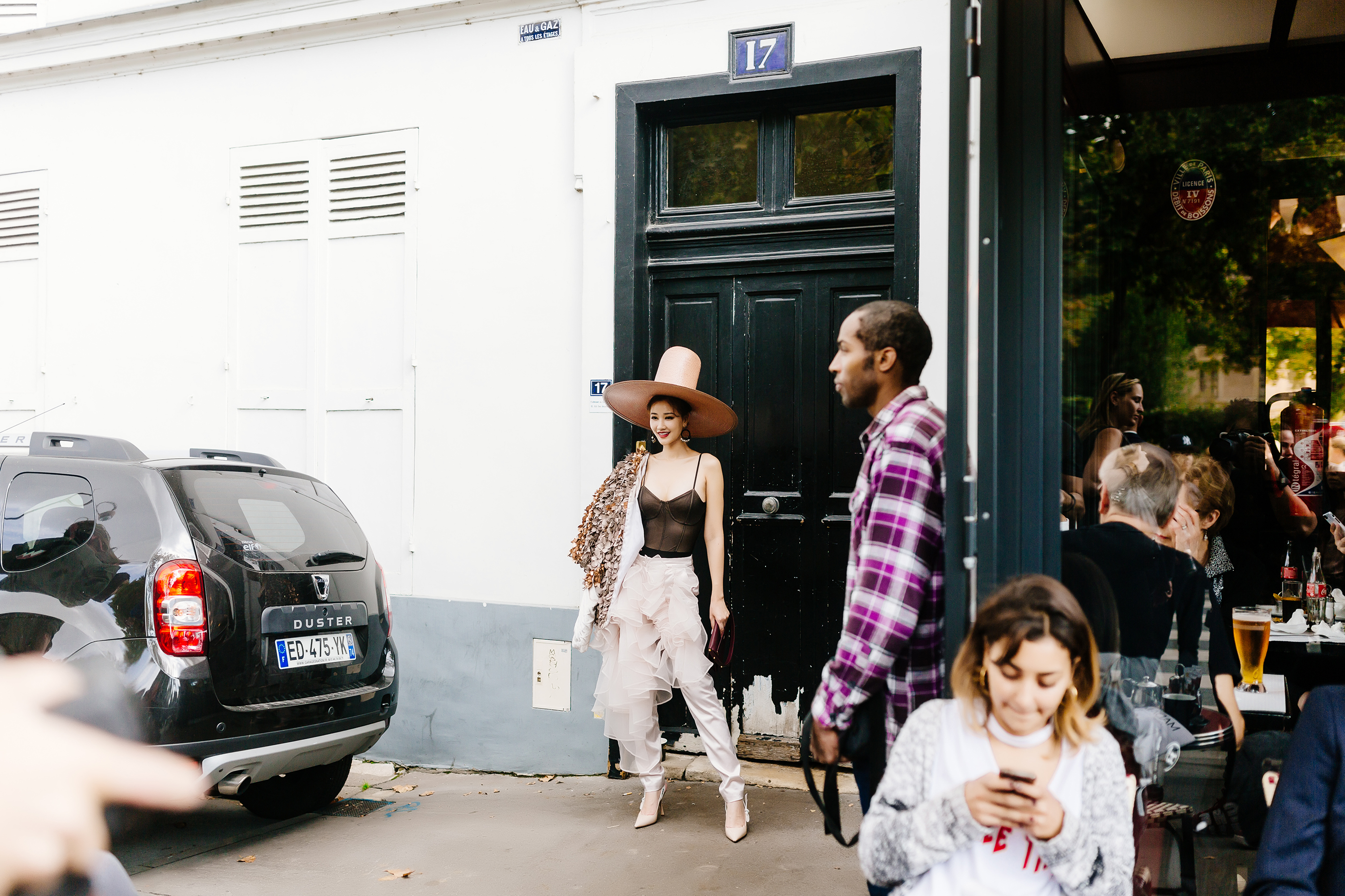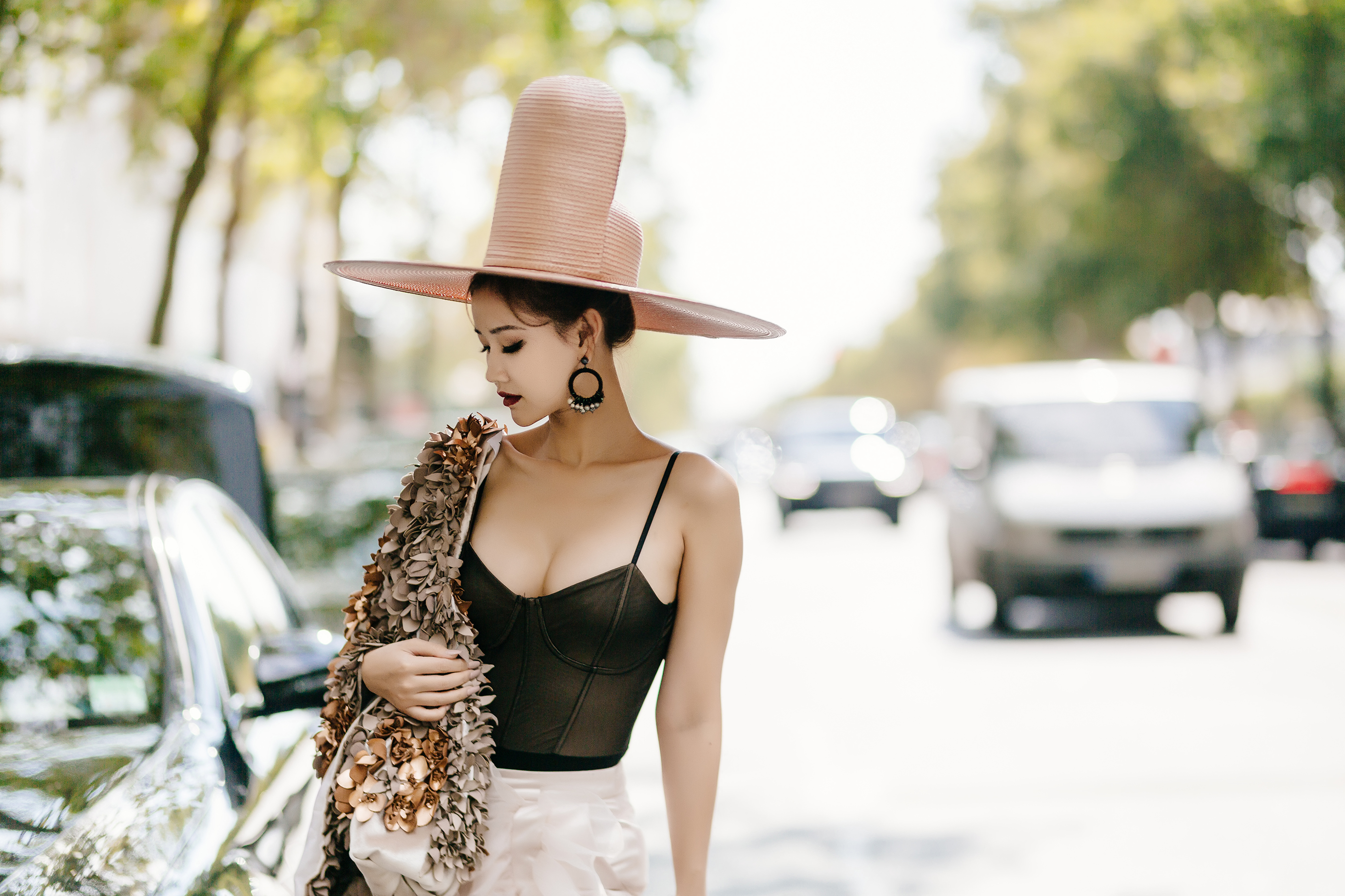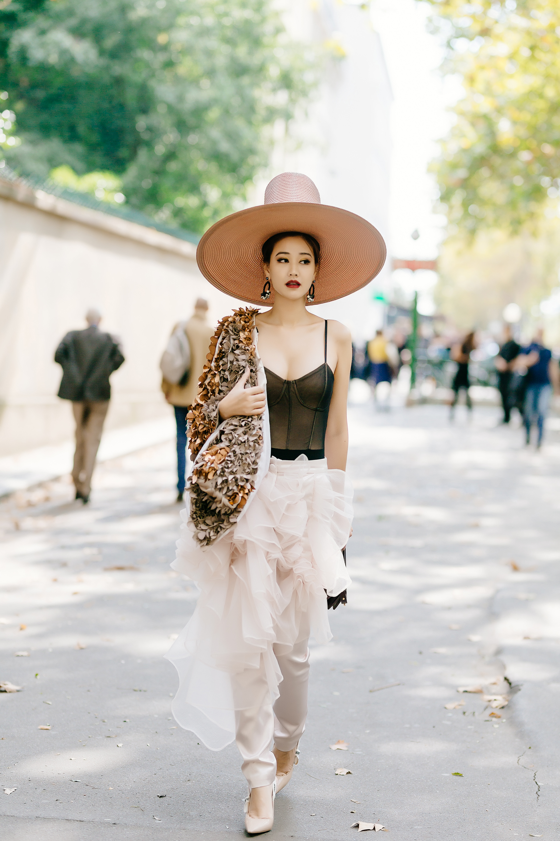 Bộ cánh khác lạ đến từ chủ nhân nhãn hàng Xuân Couture, cũng góp mặt trong khuôn khổ Paris Fashion Week. Maya không ngại đội lên đầu chiếc mũ thực hiện handmade được chế tác tại làng nghề Pháp có giá 5000€, jacket khoác hờ 10640€ và quần flowers pants giá 2500€.