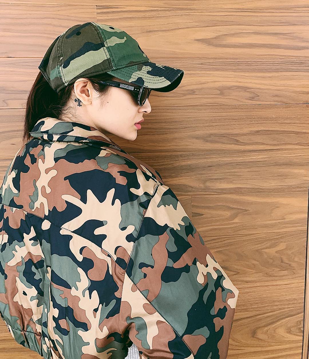 Và cũng chính nữ ca sĩ đã biến hóa phong cách bản thân theo một hình ảnh khác, năng động, chất lạnh hơn bằng chiếc áo khoác phom rộng cùng mũ lưỡi trai camo và kính mát.