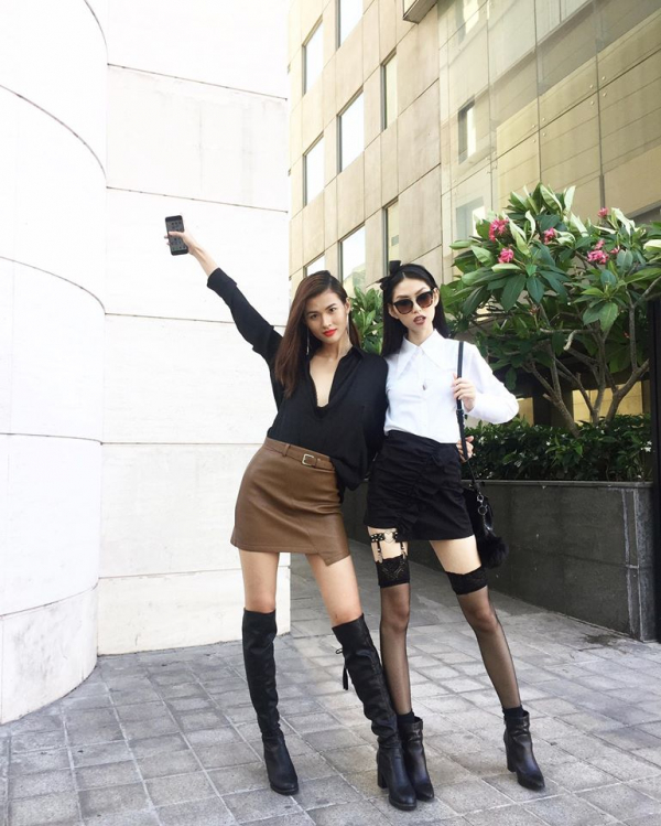 Cao Thiên Trang cũng không hề kém cạnh cô bạn của mình khi xuất hiện vô cùng gợi cảm với set đồ hòa phối từ áo sơ mi đen, chân váy da và điểm nhấn đến từ đôi boots cao sành điệu.