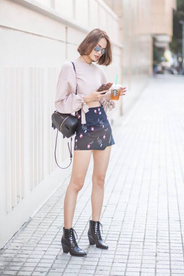 Người mẫu Thanh Thảo lại lựa chọn phong cách trẻ trung nhưng vẫn không kém phần cá tính trong việc hòa phối chiếc áo sơ mi tay nơ, chân váy in họa tiết hay thậm chí tạo điểm nhấn nhá bằng mẫu giày boots siêu sành điệu.